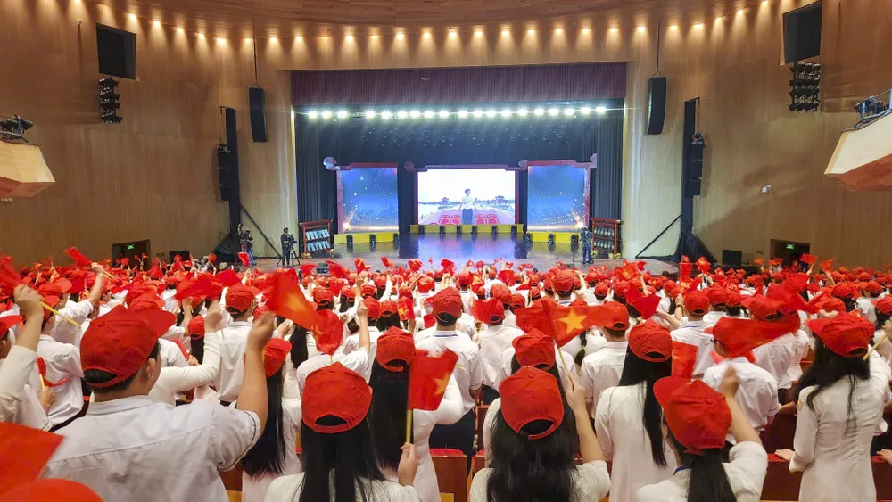 Hàng ngàn học sinh, thầy cô cùng hướng về màn hình lớn, mang theo cờ hoa và băng rôn để cổ vũ, tiếp sức cho "nhà leo núi" Lê Quang Duy Khoa. Ảnh: N.DO
