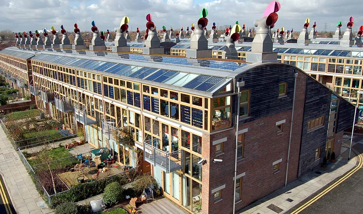Khu sinh thái BedZED, viết tắt của Beddington Zero Energy Development, hiện ra với những tòa nhà phủ kính sáng bóng, mái đầy tấm pin mặt trời và các ống gió độc đáo. Thực ra, đó là hệ thống thông gió tự nhiên (wind cowls), trái tim của công trình, giúp điều hòa không khí và giữ ấm cho các ngôi nhà hoàn toàn bằng năng lượng tái tạo.