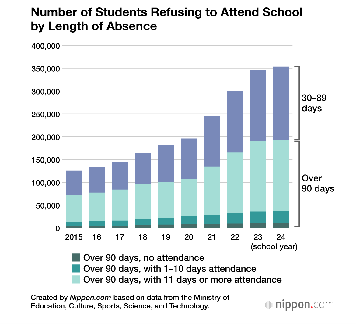 Theo khảo sát về hành vi vấn đề và nghỉ học của học sinh do Bộ Giáo dục, Văn hóa, Thể thao, Khoa học và Công nghệ Nhật Bản thực hiện, năm học 2024 ghi nhận 353.970 học sinh từ chối đến trường 30 ngày trở lên. So với năm trước, con số này tăng thêm 7.488 học sinh. So với một thập kỷ trước, tỷ lệ nghỉ học đã tăng 5,5 lần ở học sinh tiểu học và 2,2 lần ở học sinh trung học cơ sở.