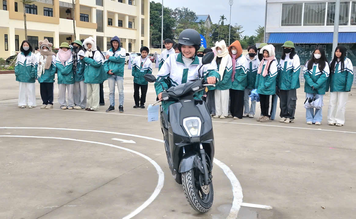 Sôi động và hào hứng nhất là phần hướng dẫn kỹ năng lái xe gắn máy và xe máy điện cho các em học sinh khối lớp 11.