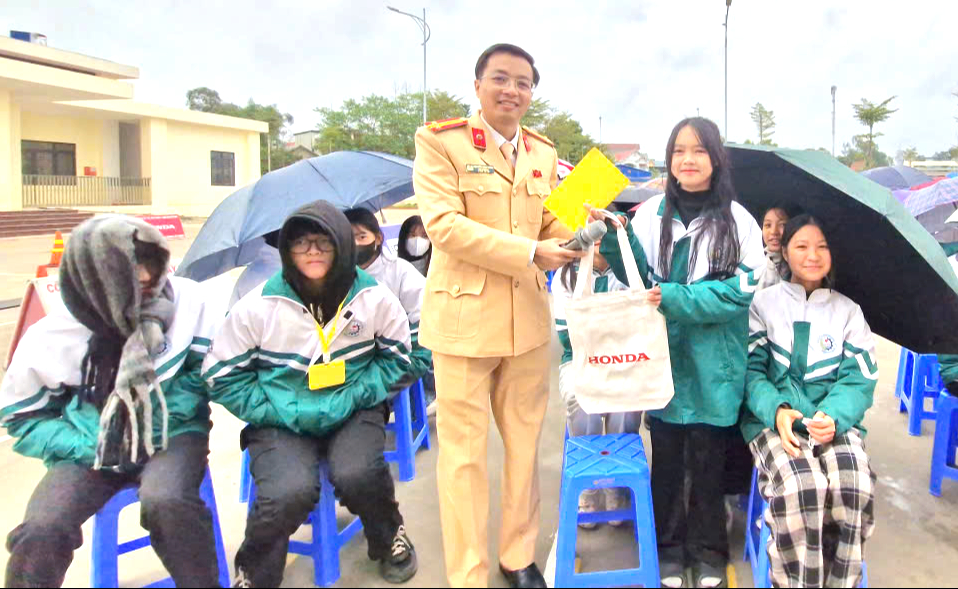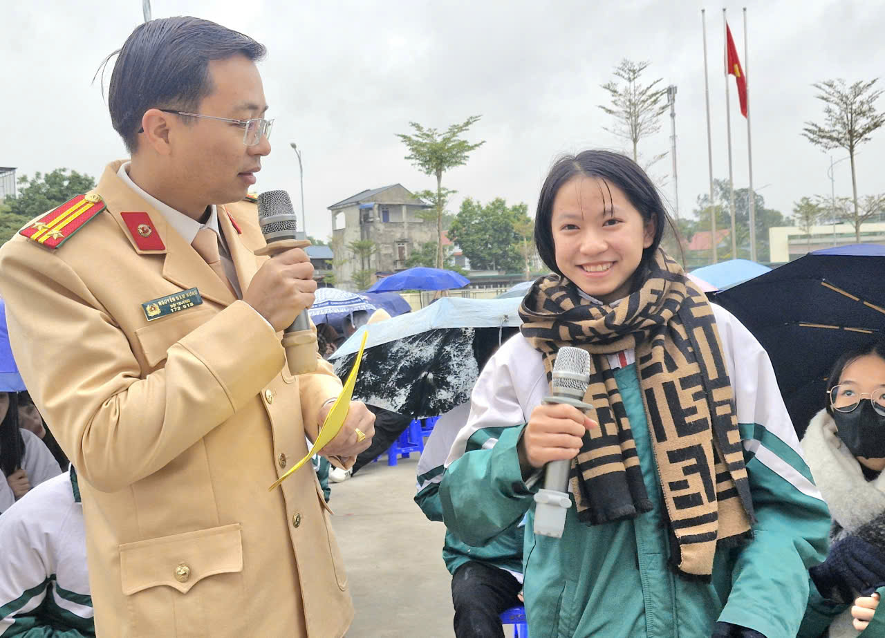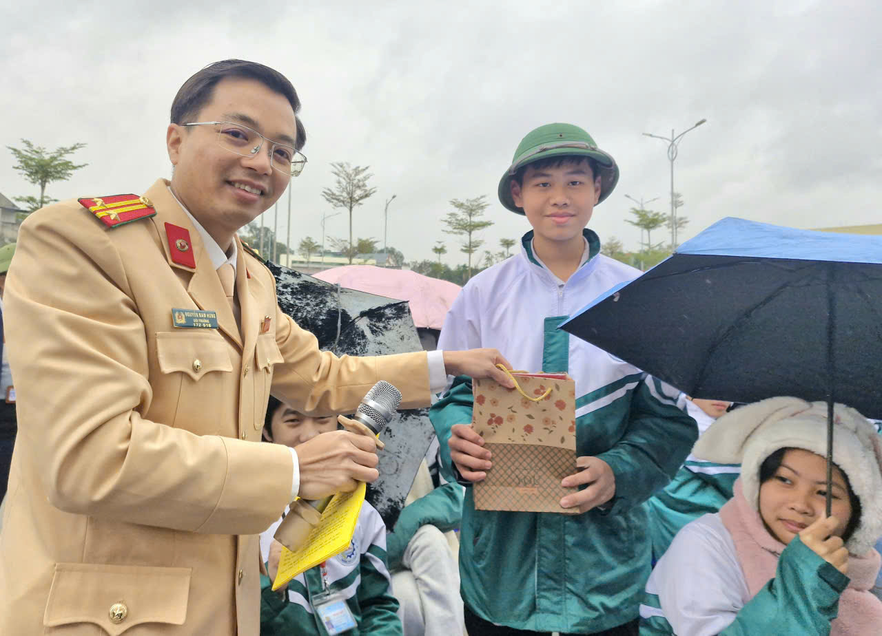 Em Đức Đoàn, học sinh lớp 11B1, Trường THPT Lý Nam Đế đã xuất sắc trả lời đúng tình huống giao thông, được Phòng CSGT Công an tỉnh Thái Nguyên tặng phần quà ý nghĩa.