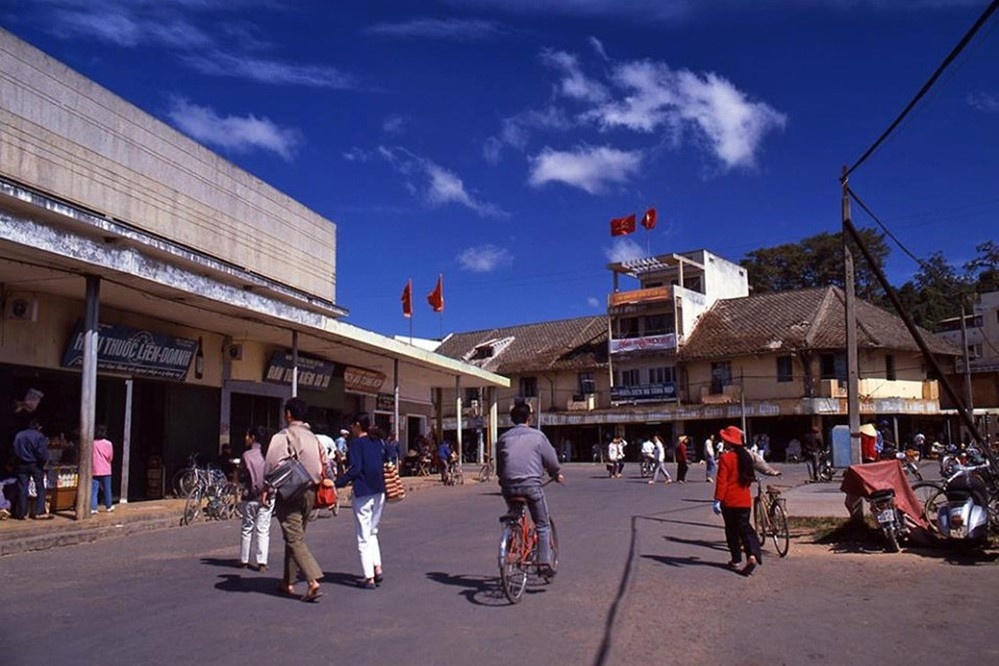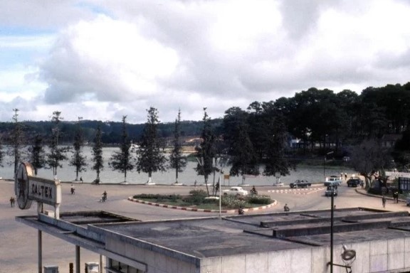 Vòng xoay Bưu điện Đà Lạt được chụp từ rạp chiếu bóng Ngọc Lan (cũ) khoảng năm 1970, khi đó còn trạm xăng Caltex. Thời điểm này, Đà Lạt ít phương tiện, người dân di chuyển chủ yếu bằng xe ngựa, xe đạp, sang hơn là xe lam, ôtô đầu tròn. Đường sá vắng bóng khách du lịch. Hiện tại, mỗi dịp cao điểm, vòng xoay này lại rơi vào tình trạng tắc nghẽn xe cộ. Ảnh: Blaine Jessee, Thành Đô.