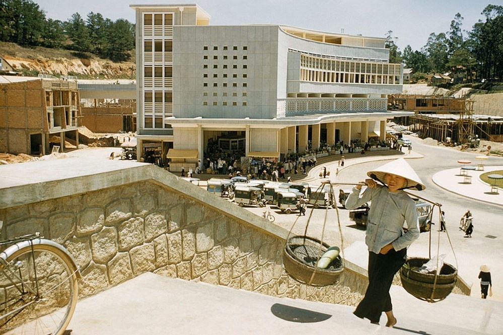 Khoảng 20 năm sau, khu chợ mới (chợ Đà Lạt ngày nay) bắt đầu được xây dựng trên vùng đất sình lầy trồng xà lách. Chiếc cầu thang chính dẫn xuống vòng xoay và nhà lồng chợ vẫn giữ nguyên, hiện nằm bên cạnh tòa nhà Galaxy Tulip trên đường Nguyễn Thị Minh Khai (phường Xuân Hương - Đà Lạt). Ảnh: Wilbur E. Garrett, Uyên Trinh.