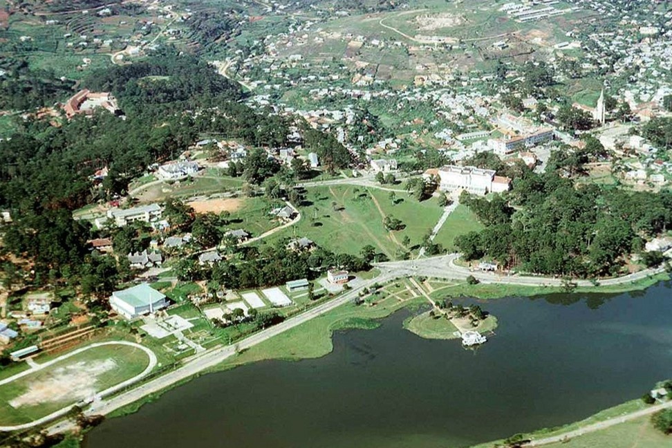 Khoảng năm 1950-1965, Đà Lạt nhìn từ trên cao còn nhiều mảng xanh, chưa nhường chỗ cho các công trình phục vụ du lịch, nhà ở. Thời điểm này, nhà hàng Thủy Tạ nổi tiếng được xây dựng trên mặt hồ Xuân Hương đã chuyển thành điểm bán thức ăn, cà phê phục vụ người dân. Sau này, vào buổi sáng, nhiều du khách vẫn lui tới nhà hàng này uống cà phê sớm, đạp vịt trên hồ. Ảnh: Bill Ronie’s, Duy Hiệu.