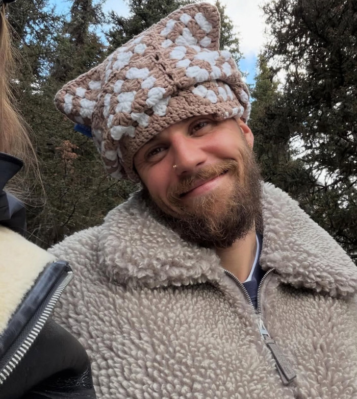 Nam ca sĩ chọn trang phục mùa lạnh gồm áo khoác lông dày, mũ len đan thủ công. Râu quai nón rậm cùng khuôn mặt mộc khiến anh trông trưởng thành, có phần khác xa hình ảnh thường thấy trên sân khấu.
