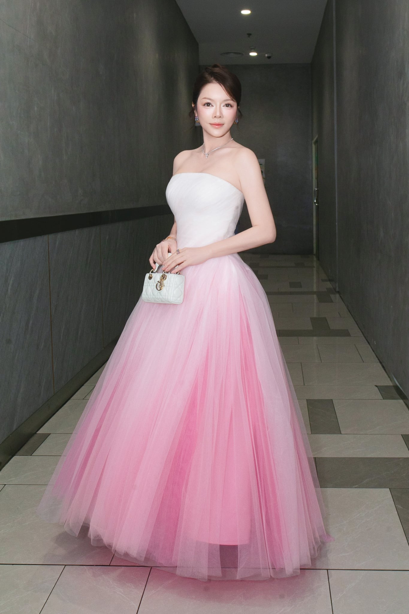 Sắc hồng dịu dàng, lãng mạn không chỉ làm nổi bật vẻ ngoài trẻ trung mà còn tạo nên một cảm giác quý phái của Lý Nhã Kỳ. Bộ trang phục giúp cô "tạm gác" lại hình ảnh gợi cảm trước đây.