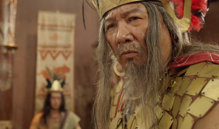 Gương mặt Vua Hùng hiện lên với ánh nhìn sắc lạnh, đầy suy tư, mái tóc và râu dài điểm bạc buông xõa, toát lên phong thái từng trải của một vị vua gánh trên vai vận mệnh quốc gia. Chỉ với vỏn vẹn một câu thoại “Ai đồng lòng, bước lên đây”, nhân vật đã phần nào truyền tải được chiều sâu nội tâm và khí chất lãnh đạo.
