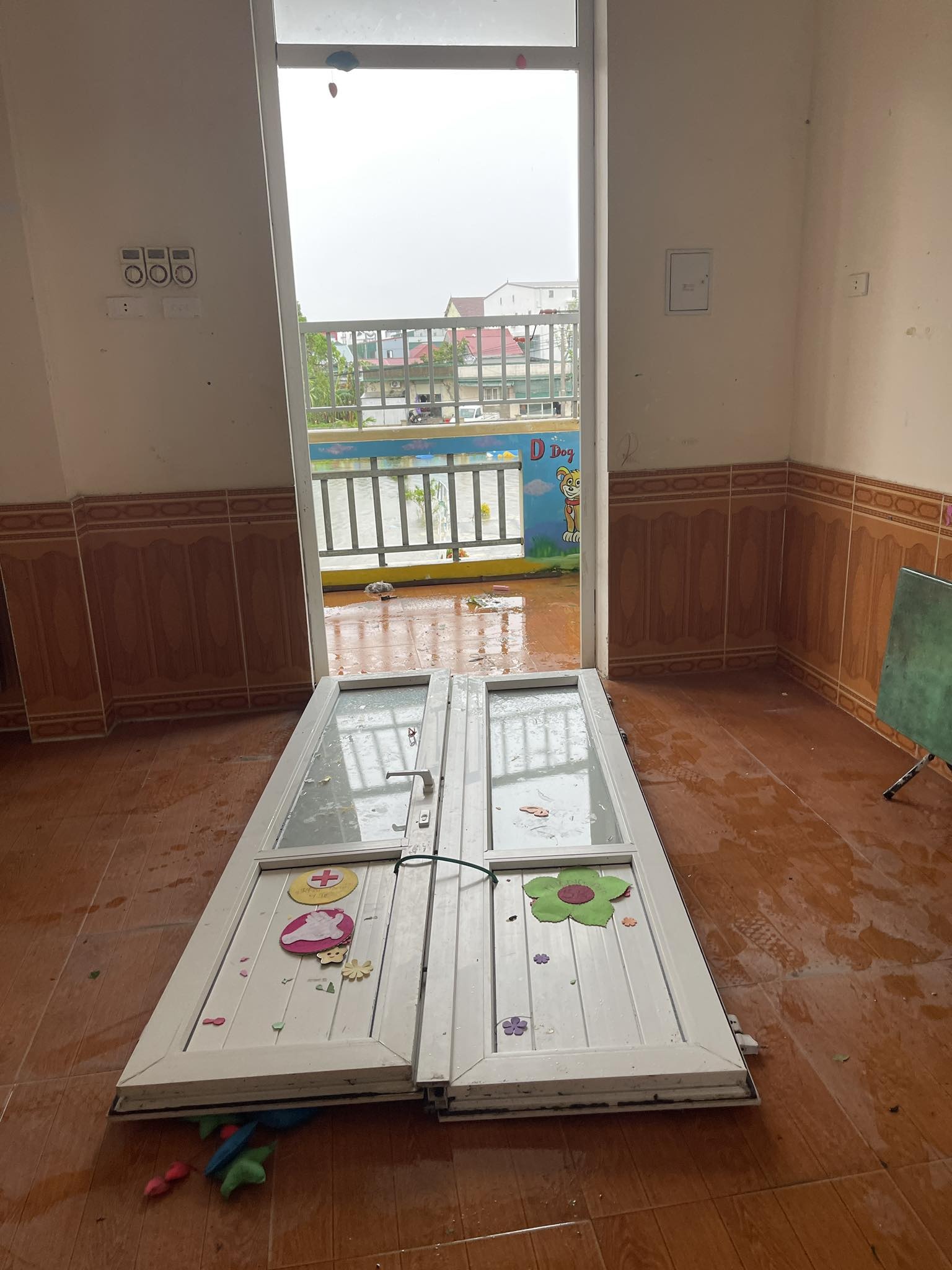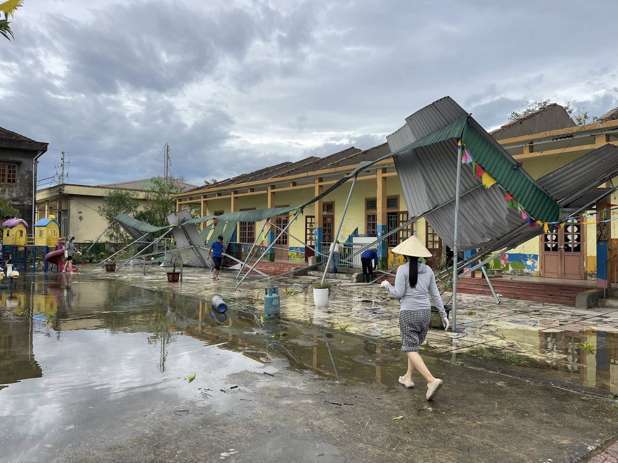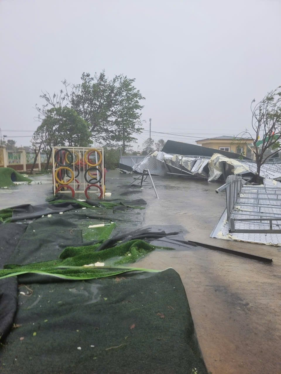 Cả hai điểm trường của trường Mầm non Xuân Lam (Nghệ An) đều thiệt hại nặng nề. Các phòng học dãy nhà 2 tầng bị tốc mái, nhà xe, mái hiên phía sau, mái tôn phía trước sập đổ, nhiều phòng học hỏng cửa, vỡ kính. Đồ chơi ngoài trời, thiết bị máy tính, đồ điện hư hỏng. Tại điểm trường số 2, toàn bộ mái khu trải nghiệm, nhà bếp đều bị cuốn bay. Nước mưa tràn vào dãy nhà cấp 4 làm hư hỏng bàn ghế, đồ dùng, trang thiết bị... Sân trường cũng ngổn ngang, cầu trượt, xích đu bị hư hỏng nặng, không thể thể sửa chữa. Thảm cỏ nhân tạo cũng bị hỏng, hệ thống điện, nước trong trường cũng bị ảnh hưởng, gây mất an toàn khi vận hành... Ảnh: FBNT.