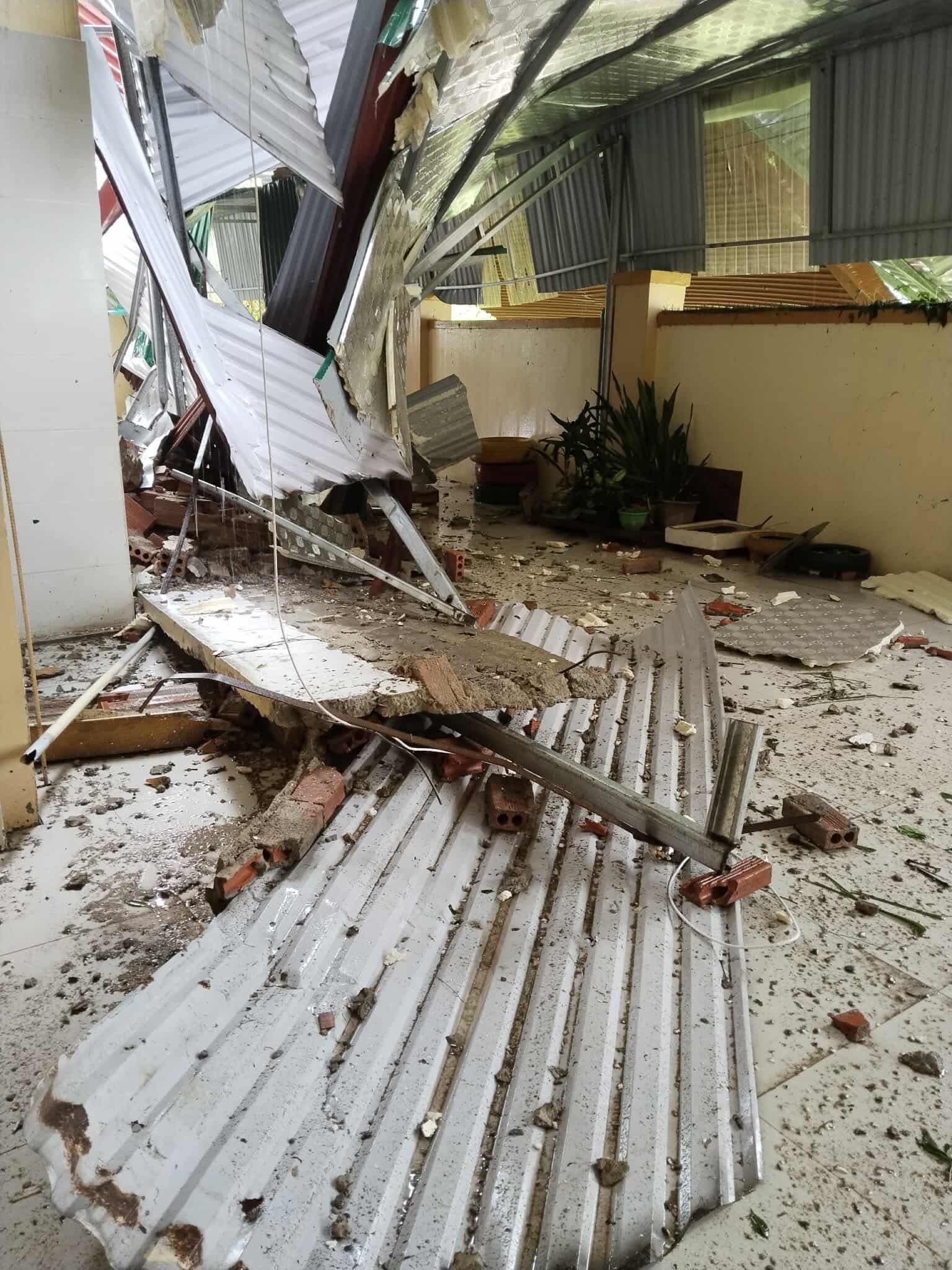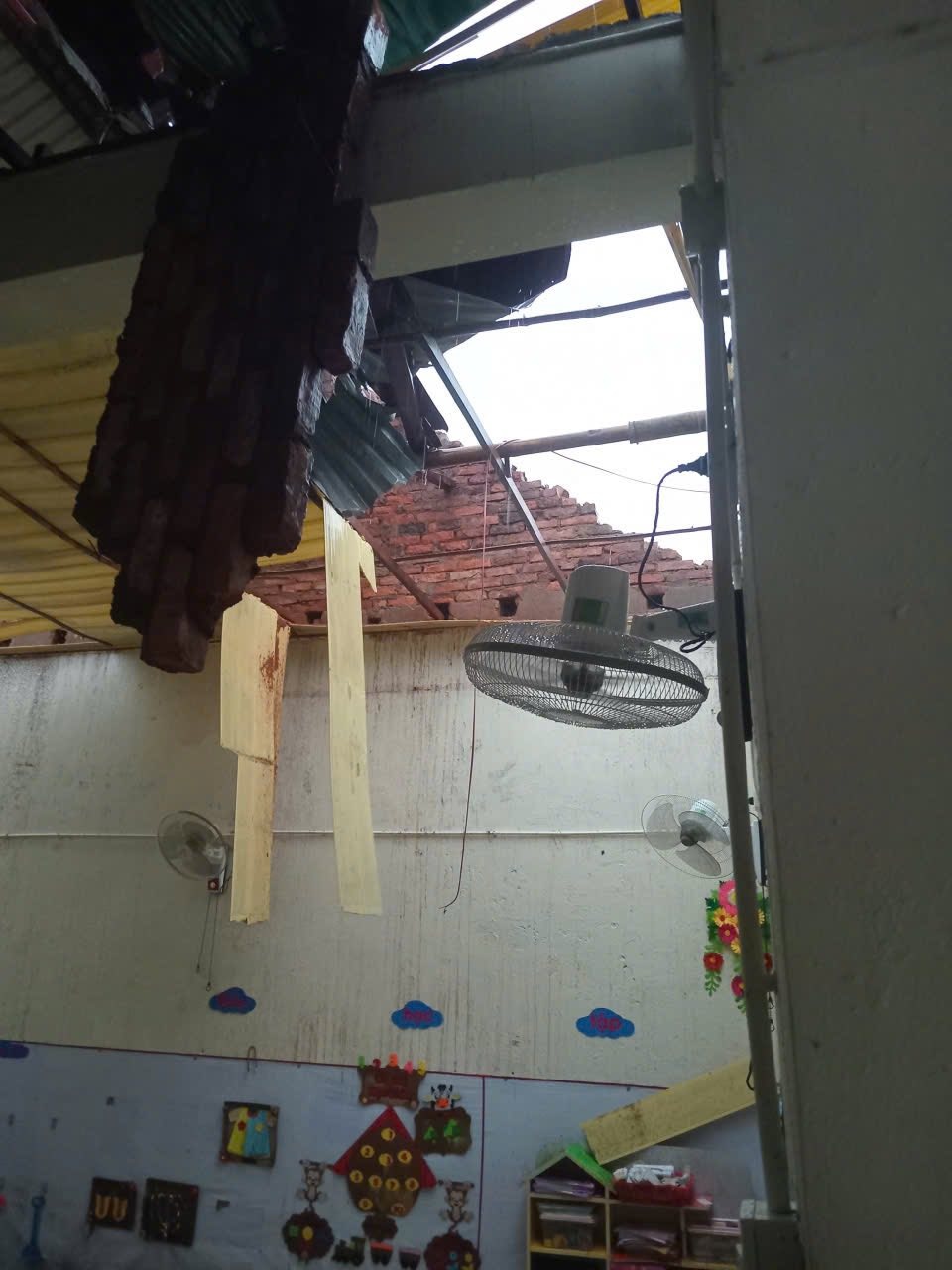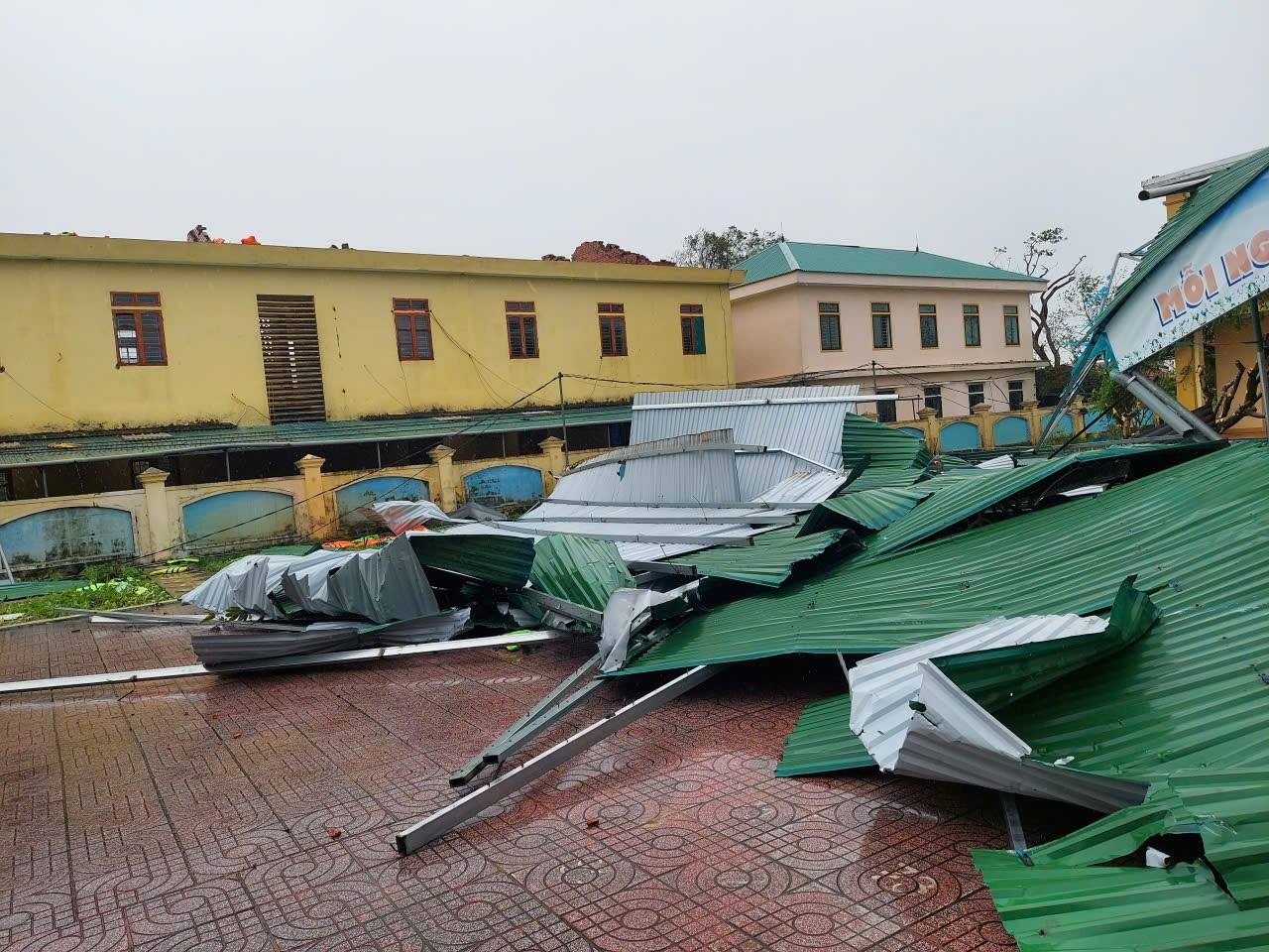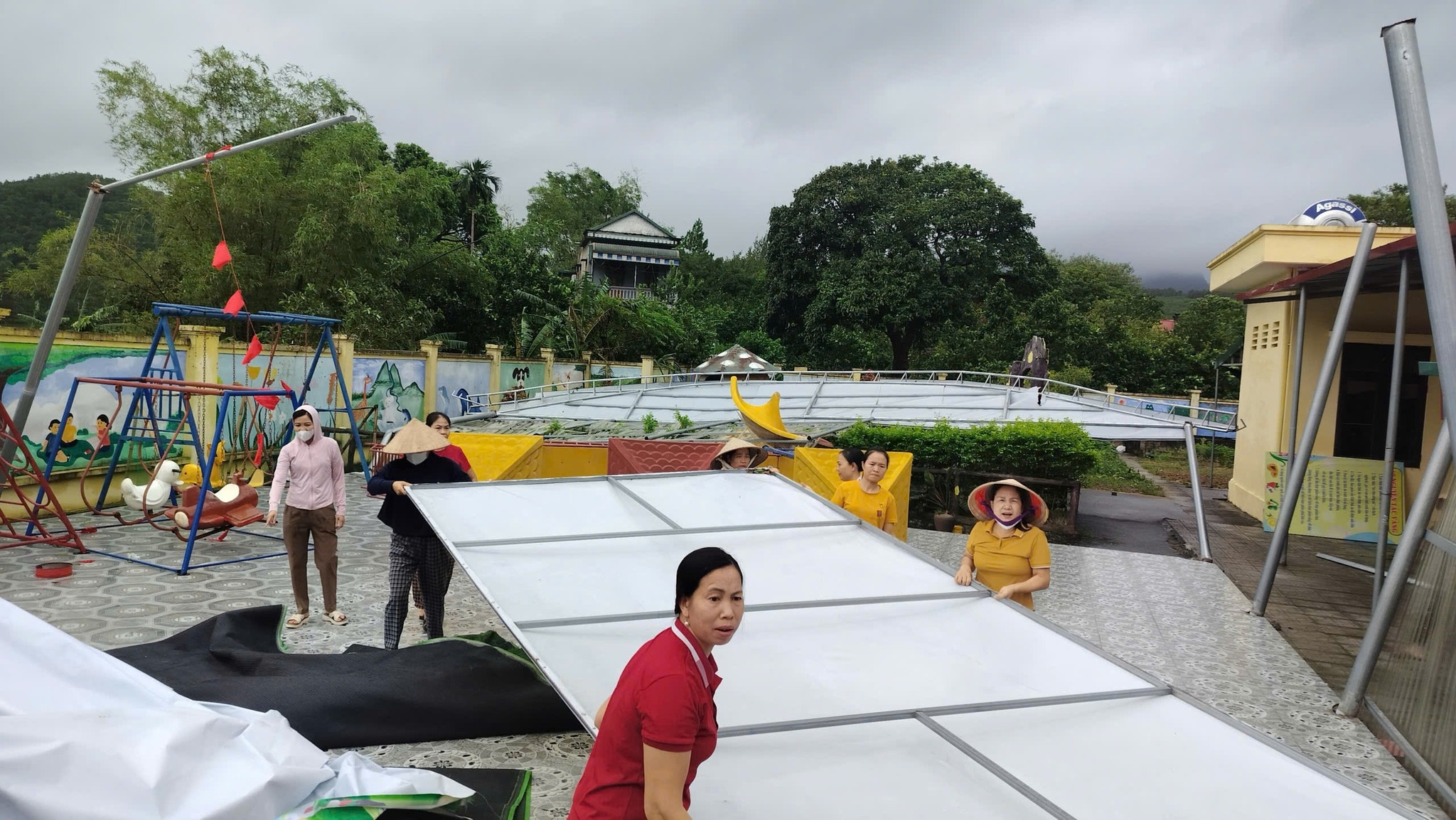Cả hai điểm trường của trường Mầm non Xuân Lam (Nghệ An) đều thiệt hại nặng nề. Các phòng học dãy nhà 2 tầng bị tốc mái, nhà xe, mái hiên phía sau, mái tôn phía trước sập đổ, nhiều phòng học hỏng cửa, vỡ kính. Đồ chơi ngoài trời, thiết bị máy tính, đồ điện hư hỏng. Tại điểm trường số 2, toàn bộ mái khu trải nghiệm, nhà bếp đều bị cuốn bay. Nước mưa tràn vào dãy nhà cấp 4 làm hư hỏng bàn ghế, đồ dùng, trang thiết bị... Sân trường cũng ngổn ngang, cầu trượt, xích đu bị hư hỏng nặng, không thể thể sửa chữa. Thảm cỏ nhân tạo cũng bị hỏng, hệ thống điện, nước trong trường cũng bị ảnh hưởng, gây mất an toàn khi vận hành... Ảnh: FBNT.