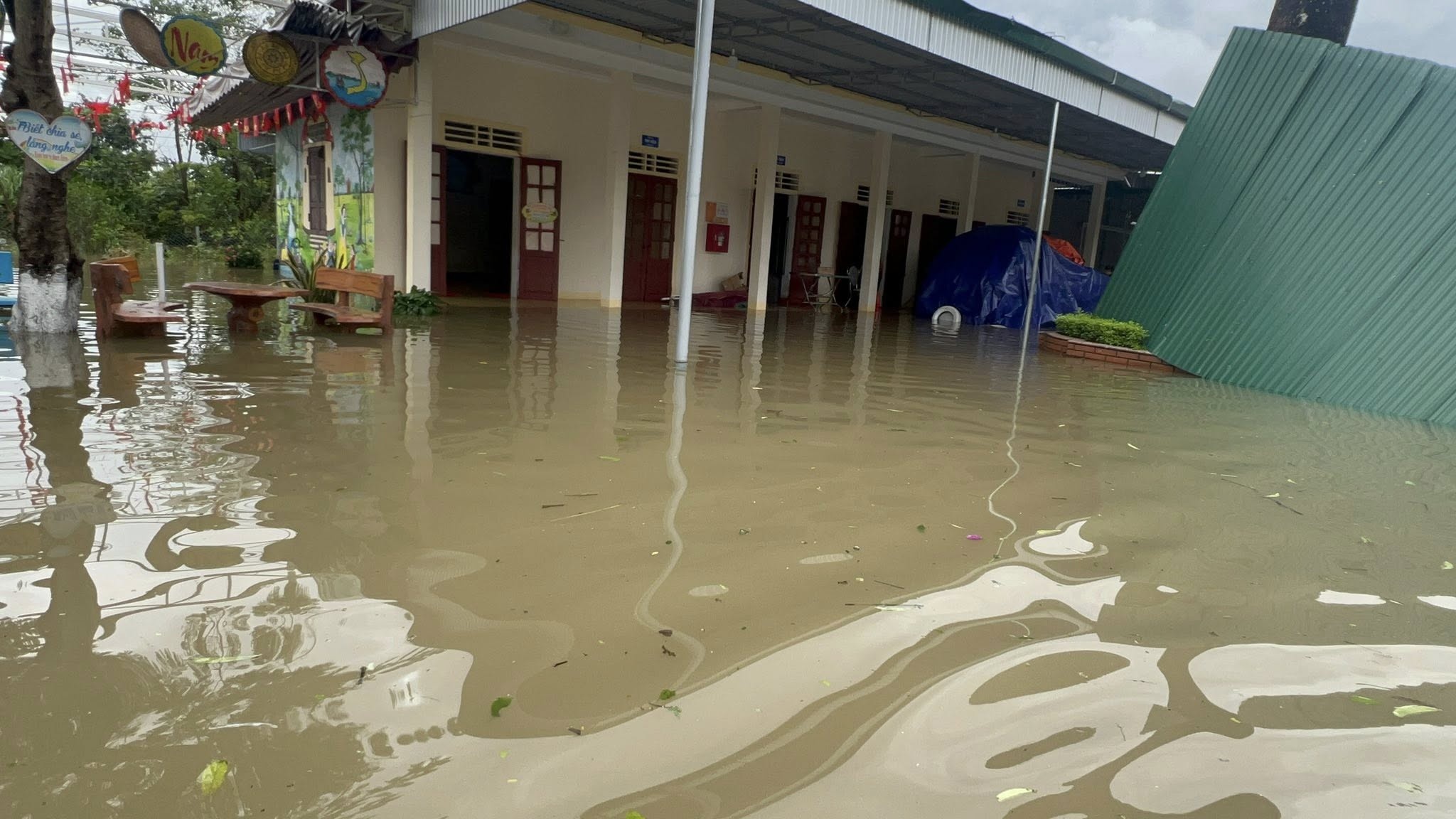 Theo báo cáo của Sở GD&ĐT một số địa phương, đến nay, bão Bualoi chưa gây thiệt hại về người. Tuy nhiên, thiệt hại về cơ sở vật chất cho thấy mức độ ảnh hưởng nghiêm trọng. Tại Thừa Thiên Huế, 134 trường học bị ảnh hưởng, ước tính thiệt hại khoảng 1,1 tỷ đồng; một số điểm trường vùng trũng phải tạm nghỉ học. Tại Nghệ An, 483 cơ sở giáo dục bị ảnh hưởng, thiệt hại gần 300 tỷ đồng; học sinh toàn tỉnh nghỉ học để bảo đảm an toàn. Ảnh: Trường Mầm non Hưng Tây (Nghệ An).