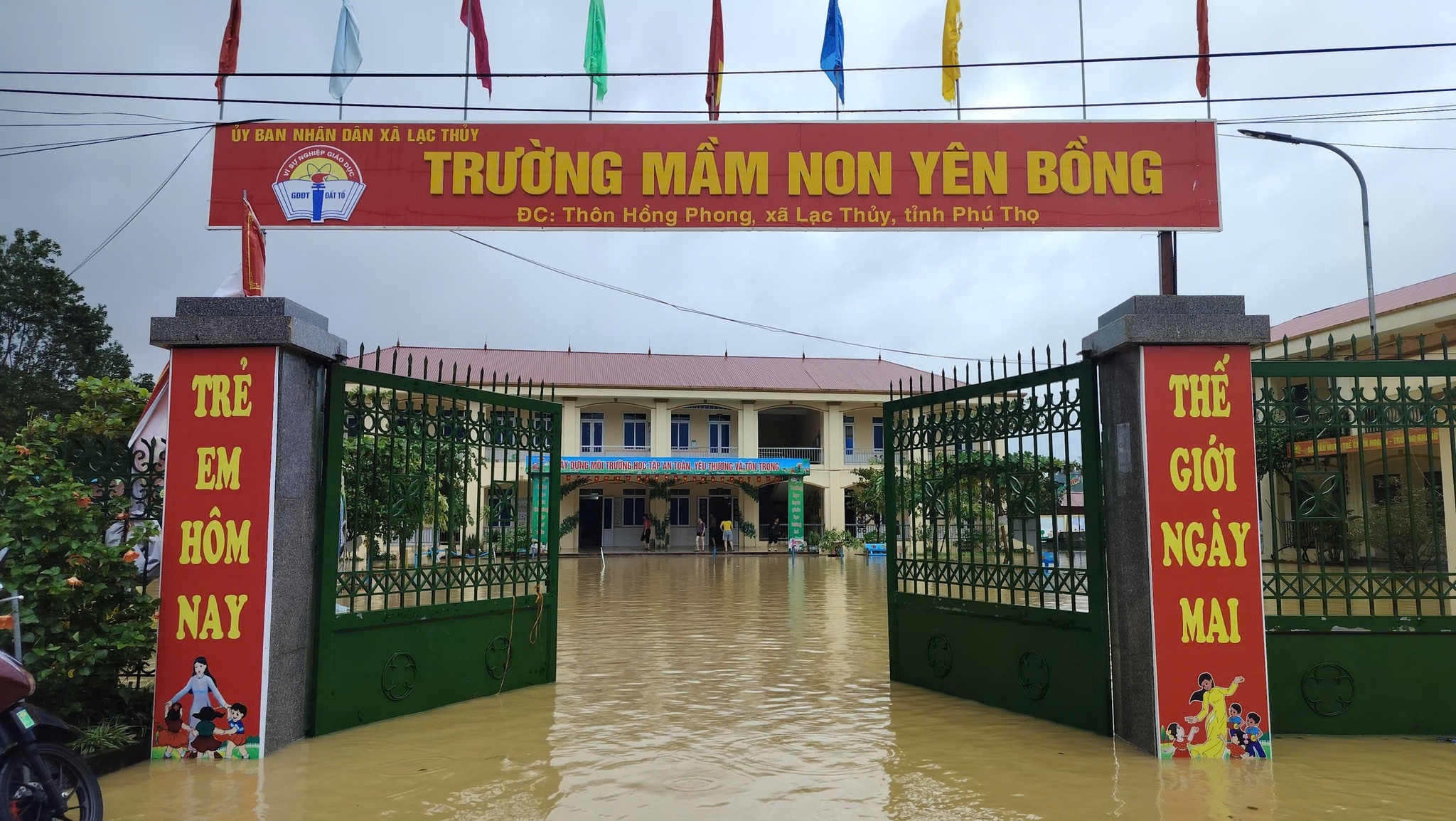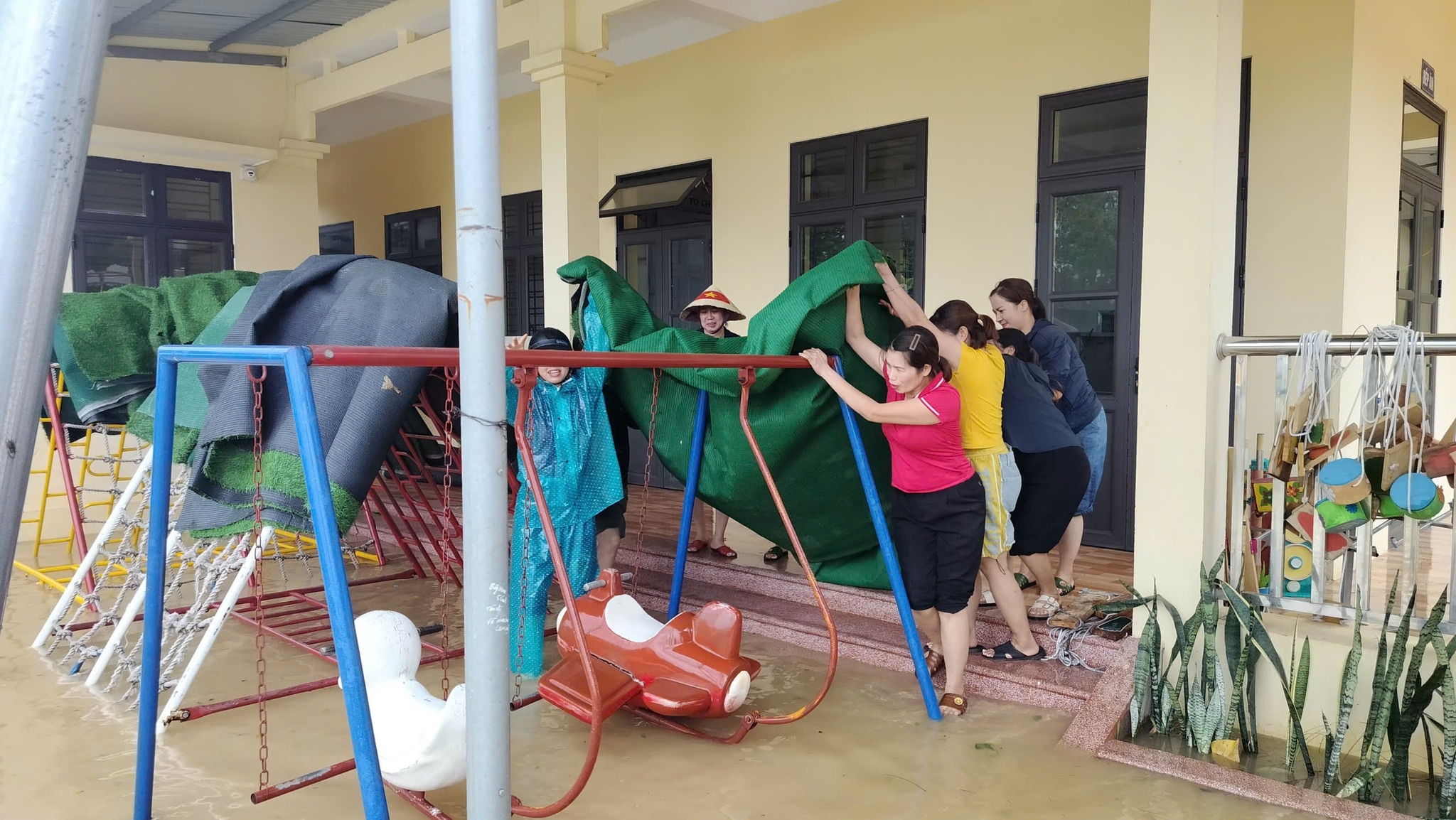 Tại trường Mầm non Yên Bồng (xã Lạc Thủy, Phú Thọ), ảnh hưởng của cơn bão số 10 đã làm tốc mái, gió cuốn bay khu vận động ra xa, làm hỏng nhiều đồ dùng, đồ chơi. Bên cạnh đó, nước lũ lên nhanh khiến trường ngập sâu, cán bộ, giáo viên, nhân viên nhà trường đã nhanh chóng di chuyển các trang thiết bị, đồ dùng để phòng tránh hư hại. Ảnh: FBNT.