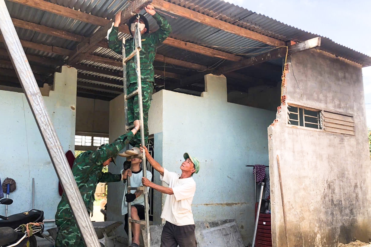 Không chỉ hỗ trợ về kinh phí, cán bộ, chiến sĩ Đồn Biên phòng Cửa khẩu Thuận An còn trực tiếp xuống tham gia tháo dỡ mái cũ, vận chuyển vật liệu và lợp lại mái nhà.