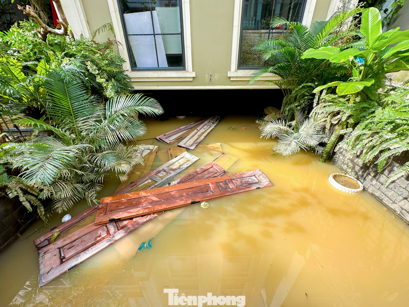 Rác thải nằm ngổn ngang, bám đầy trên cửa sắt, lan can và bậc thềm các ngôi nhà ven sông.