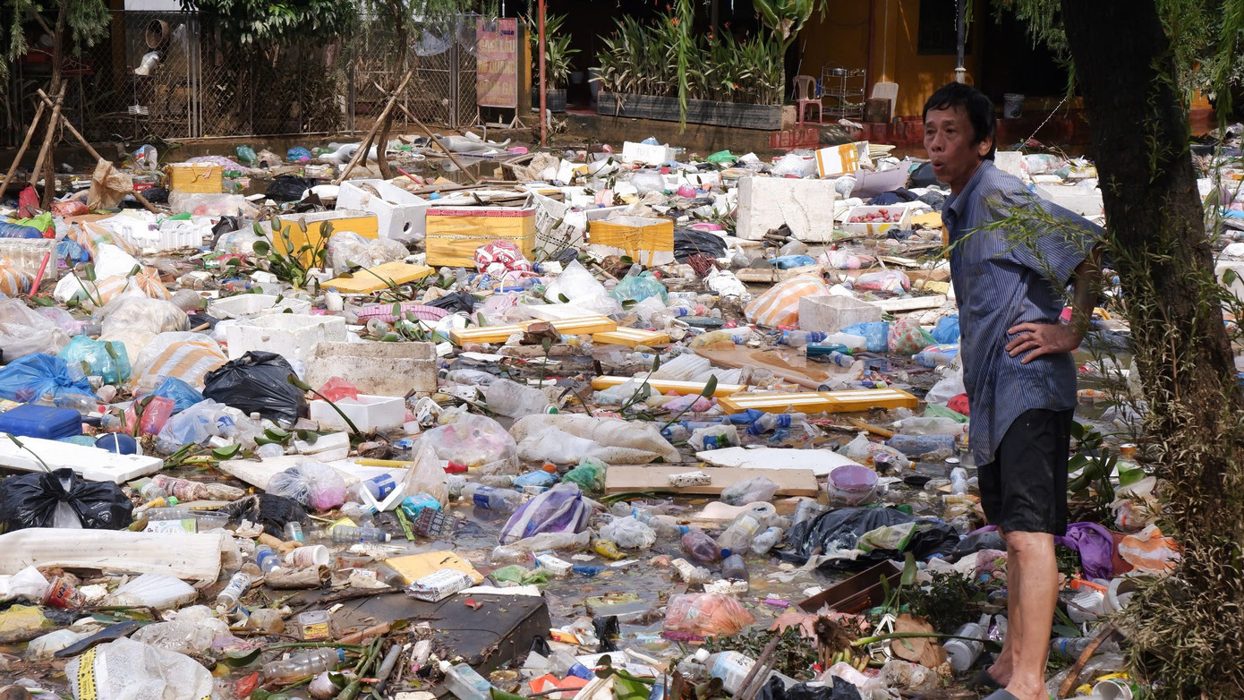 Một người dân tìm kiếm đồ đạc bị nước lũ cuốn trôi trong ngổn ngang rác tại Chùa Cầu.
