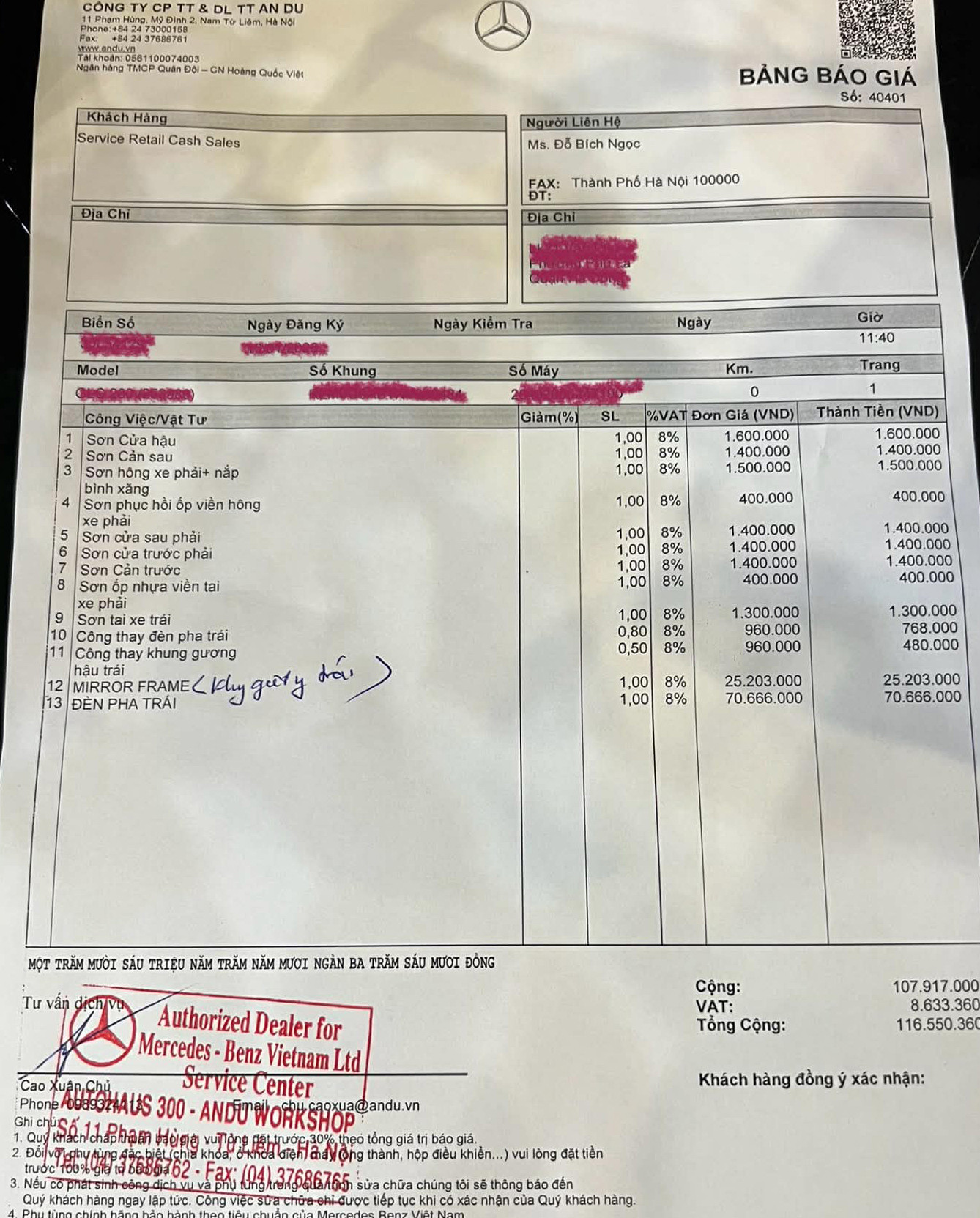 Cụ thể, theo thông báo của Cơ quan Cảnh sát điều tra Công an TP Hà Nội, kết luận của Hội đồng định giá trong tố tụng UBND phường Đại Mỗ cho biết, tổng chi phí sửa chữa các vết xước và thay mới linh kiện cho chiếc GLC 200 chỉ là 56,3 triệu đồng. Trong khi đó, đại lý chính hãng Mercedes-Benz An Du (phường Nam Từ Liêm, Hà Nội) báo giá sửa chữa là 116,5 triệu đồng.