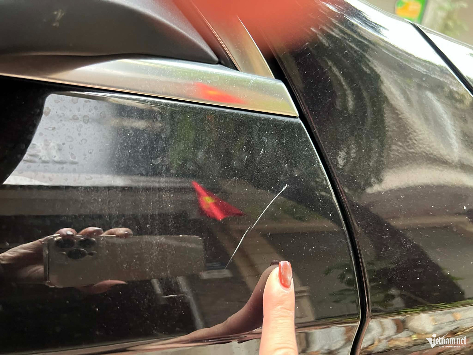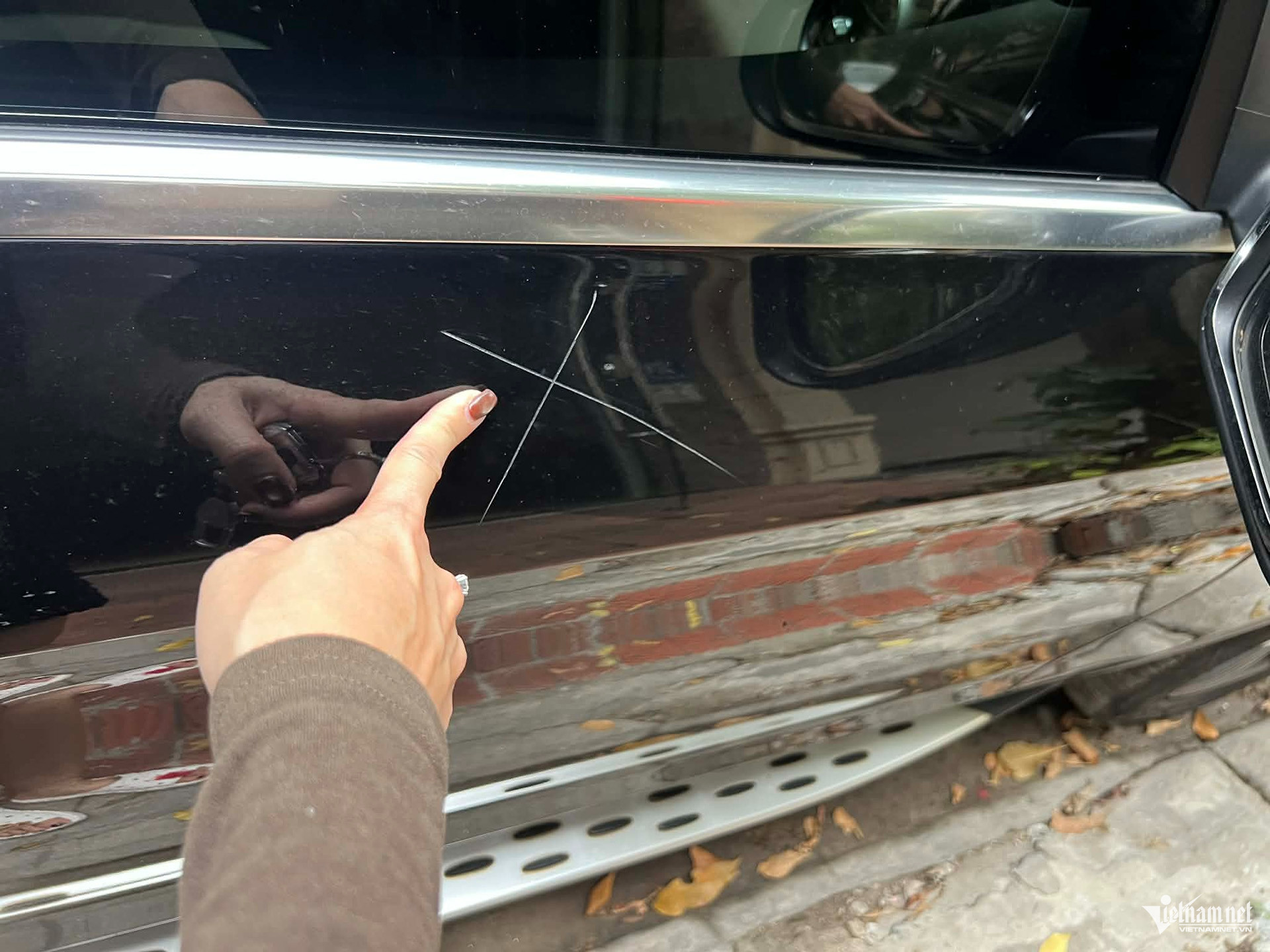 Chị Đỗ Bích Ngọc chỉ vào vết xước trên chiếc Mercedes-GLC 200 của mình. Ảnh: NVCC