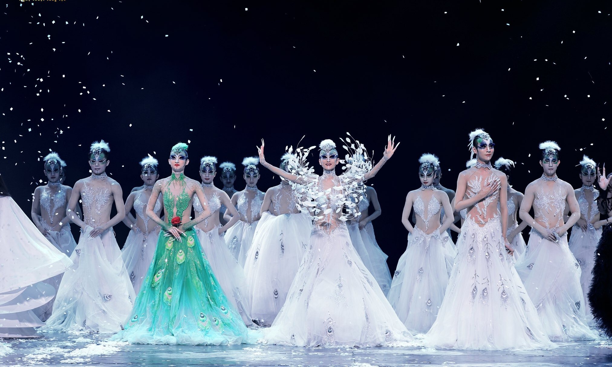 Dàn diễn viên vở vũ kịch “Khổng Tước – The Peacock Hanoi 2026” chào khán giả tại Nhà hát Hồ Gươm đêm 8/3.