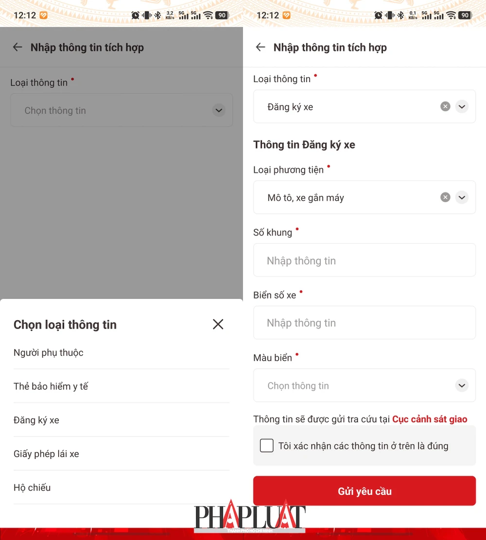 Sau khi đăng nhập vào ứng dụng, bạn hãy chuyển sang mục Ví giấy tờ - Tích hợp giấy tờ - Tạo mới yêu cầu - Đăng ký xe, điền đầy đủ các thông tin cần thiết, bao gồm biển số xe và số khung. Hệ thống sẽ đối chiếu dữ liệu với cơ sở dữ liệu đăng ký xe của cơ quan công an.