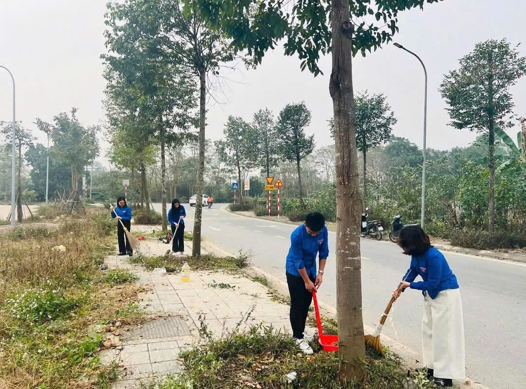 Đoàn viên, thanh niên xã Đông Anh ra quân dọn vệ sinh, thu gom rác thải, chỉnh trang tuyến đường tự quản, góp phần xây dựng cảnh quan sáng, xanh, sạch, đẹp chào mừng bầu cử. Ảnh: ST
