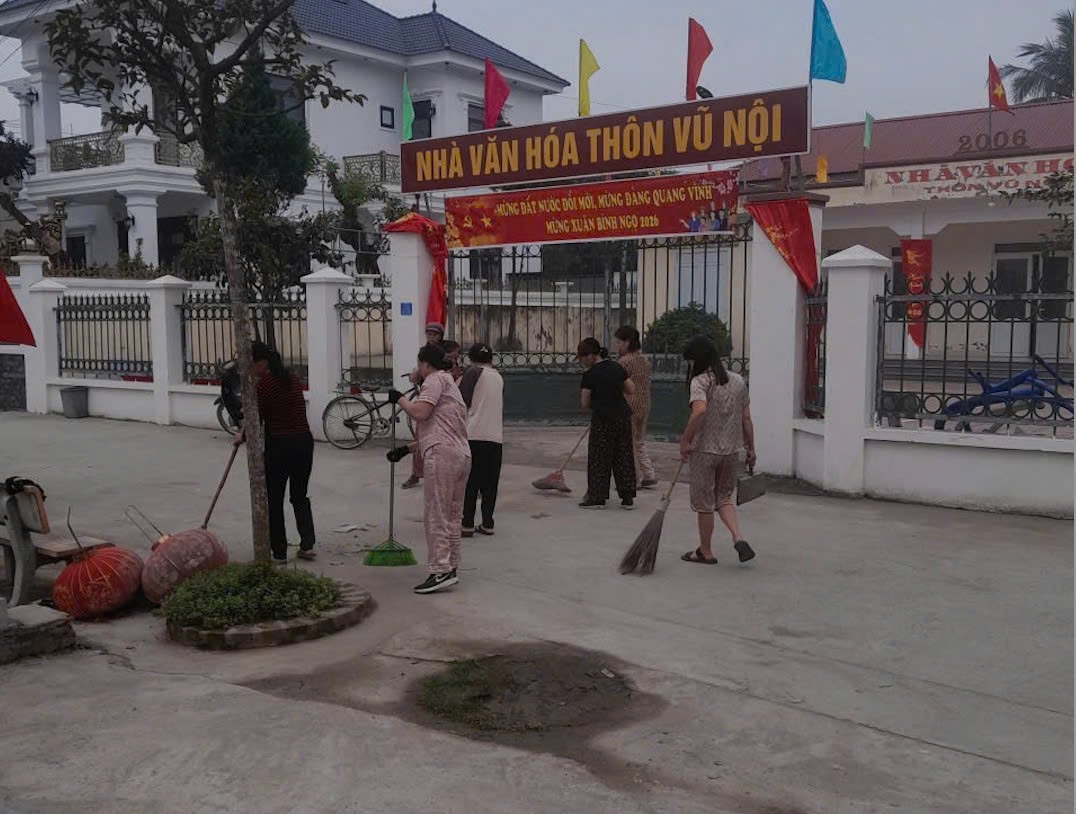 Cán bộ xã Ứng Thiên tham gia tổng vệ sinh môi trường, chỉnh trang khu vực nhà văn hóa và các tuyến đường thôn xóm, tạo không khí phấn khởi hướng tới bầu cử đại biểu Quốc hội và HĐND các cấp nhiệm kỳ 2026-2031. Ảnh: ST