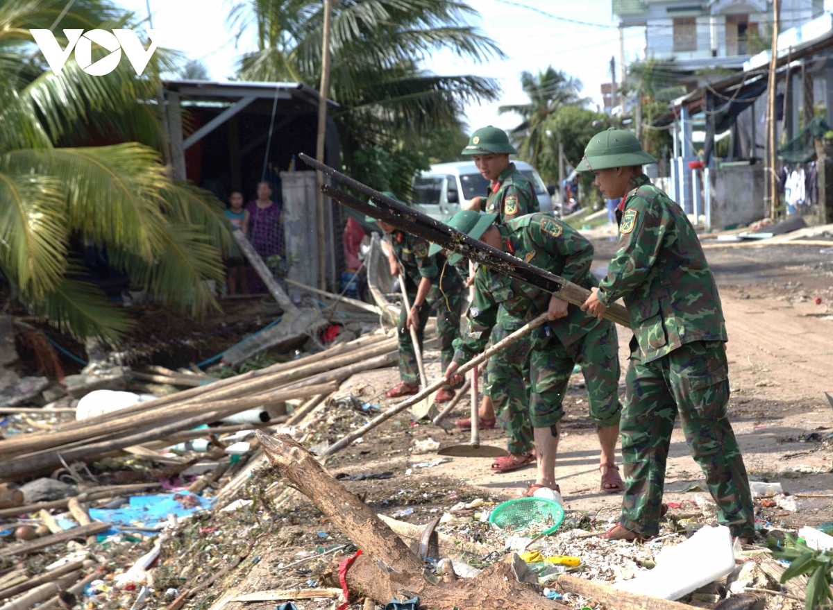 Sau thiên tai, lực lượng chức năng tới hỗ trợ nhân dân thu dọn, vệ sinh đường phố.