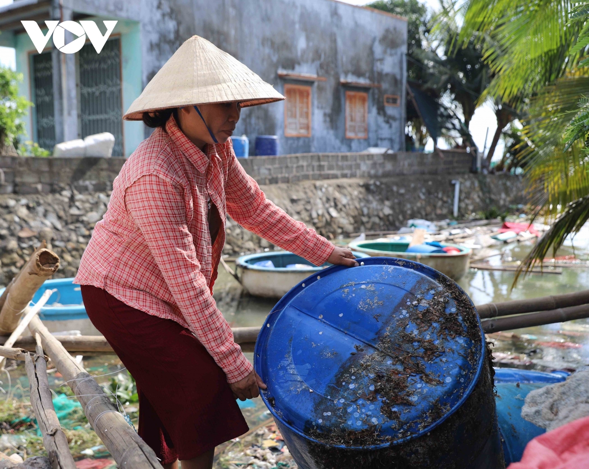 Thu dọn những phao nuôi trồng thủy sản của gia đình bị trôi dạt, sớm khôi phục lồng bè.