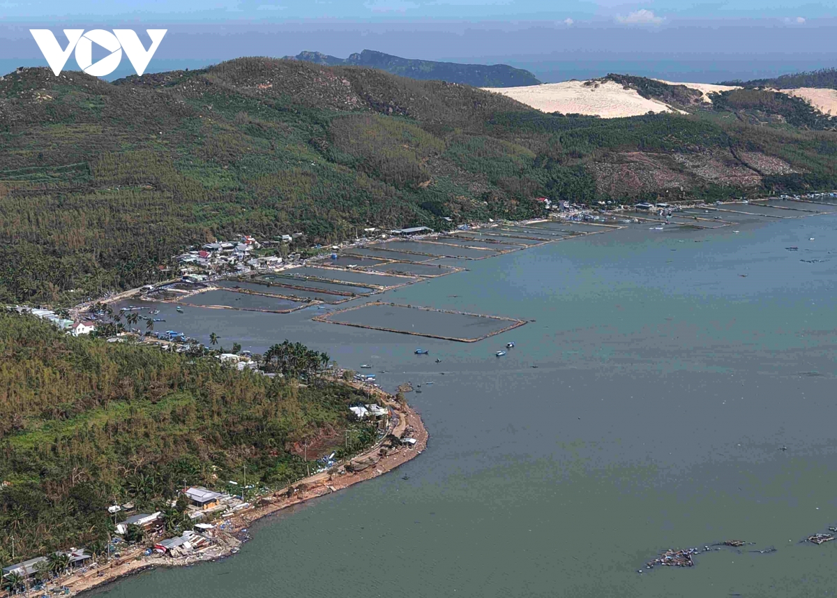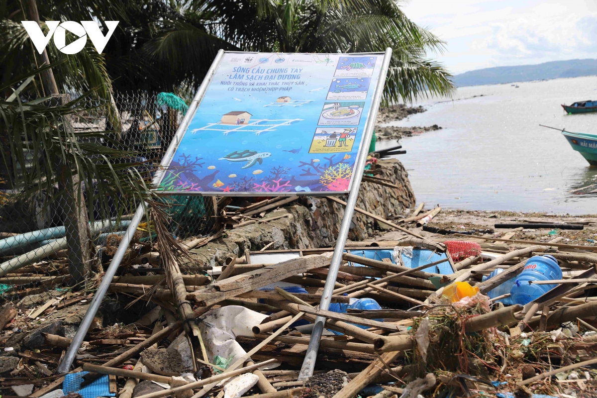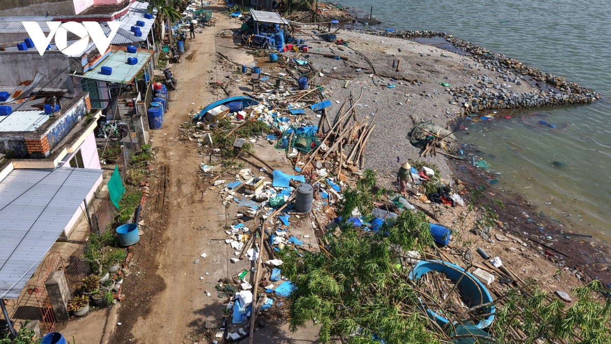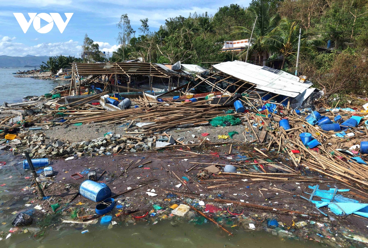 Khu vực ven biển ngập mảnh vỡ lồng bè, dụng cụ nuôi trồng thủy sản, mái tôn và xà gồ.