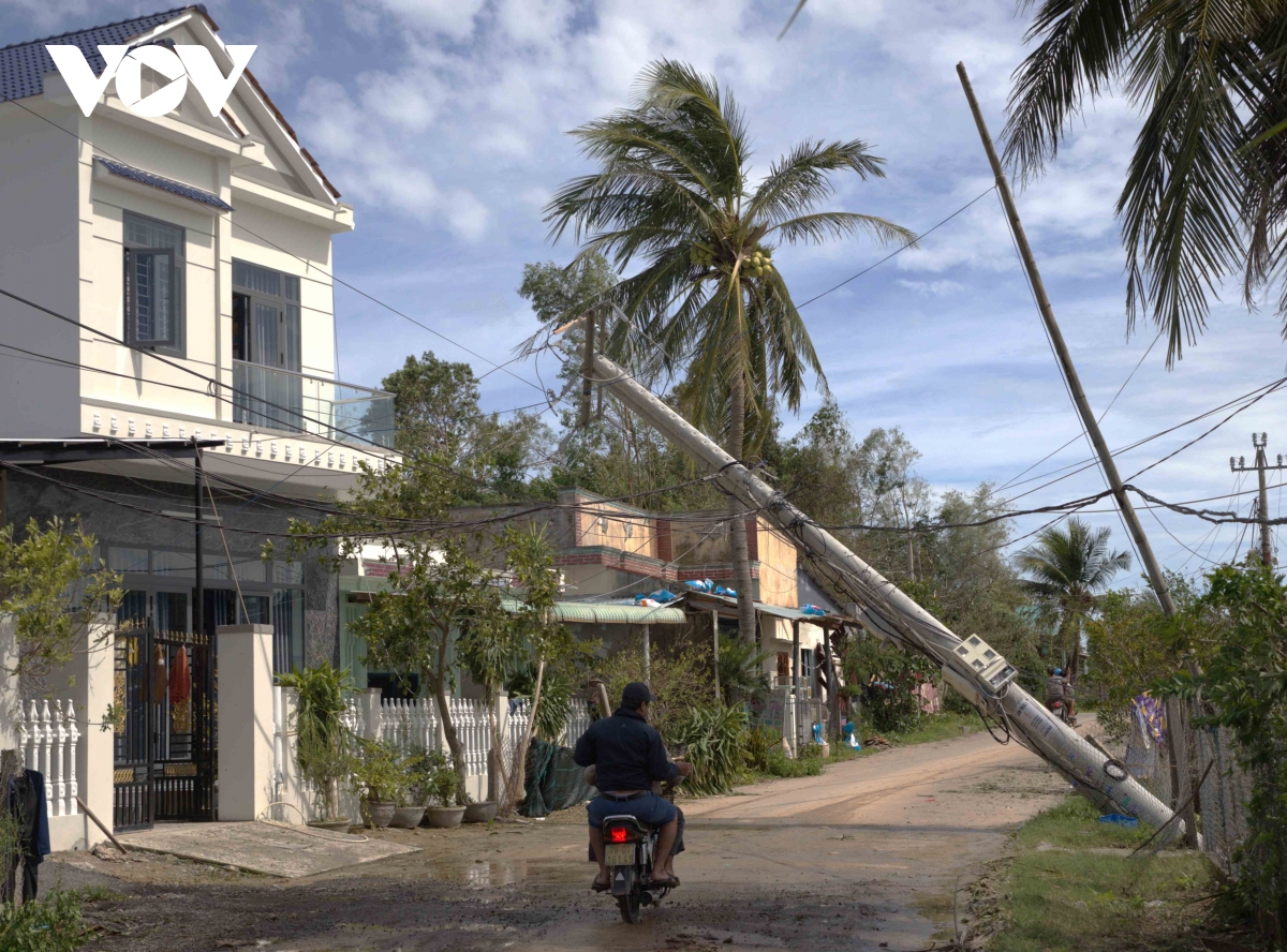 Bão số 13 đã làm trụ điện ngã độ gây mất điện và cản trở giao thông.
