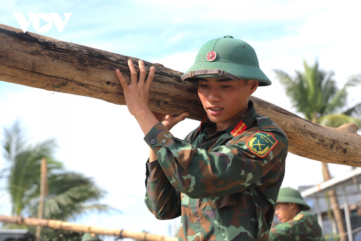 Một chiến sĩ trẻ cố gắng vác cây cột gỗ khô sang lề đường để đảm bảo giao thông được thông suốt.