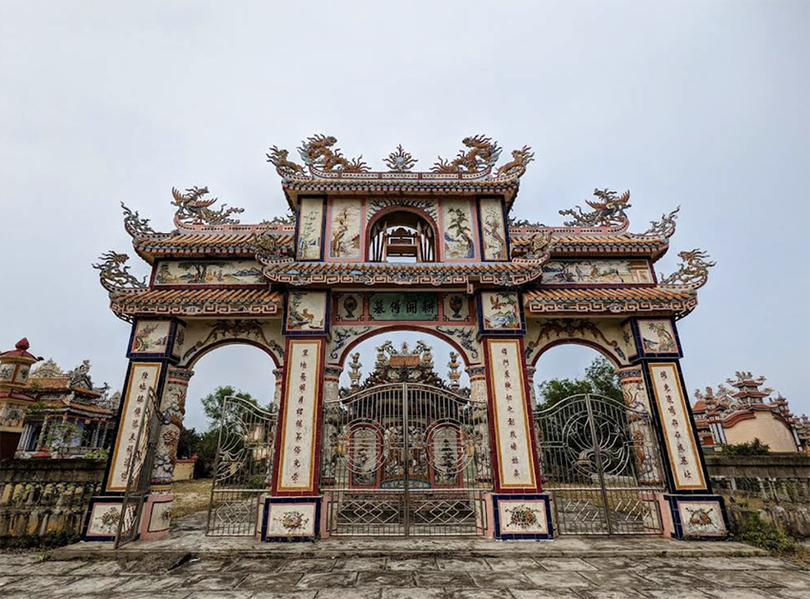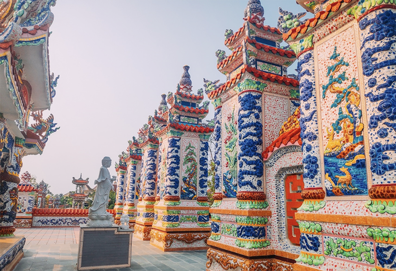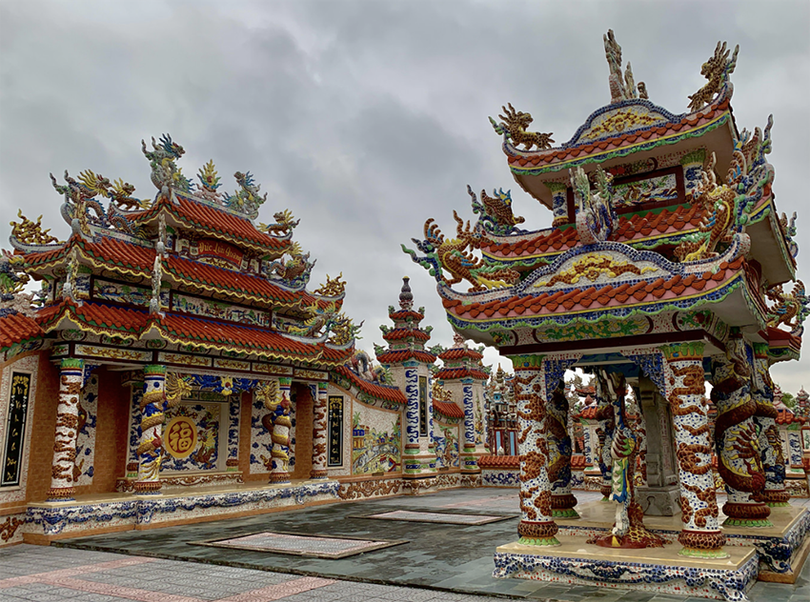Để tạo nên sự bền vững và vẻ đẹp vĩnh cửu, các công trình đều được xây dựng từ những vật liệu cao cấp nhất: bê tông cốt thép kiên cố, đá hoa cương nguyên khối, gạch men nhập khẩu, kính màu và đặc biệt là nghệ thuật khảm sành sứ tinh xảo.