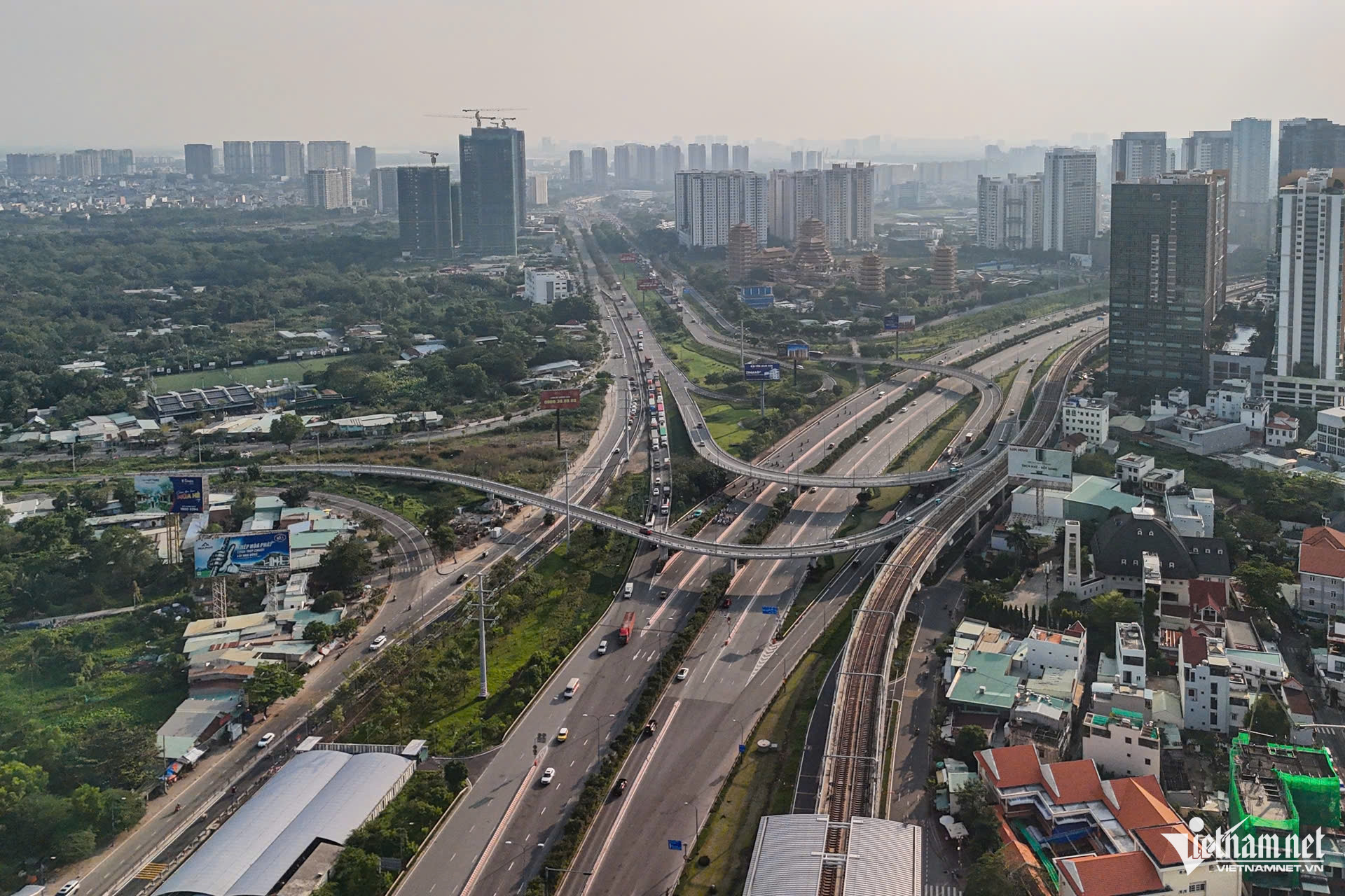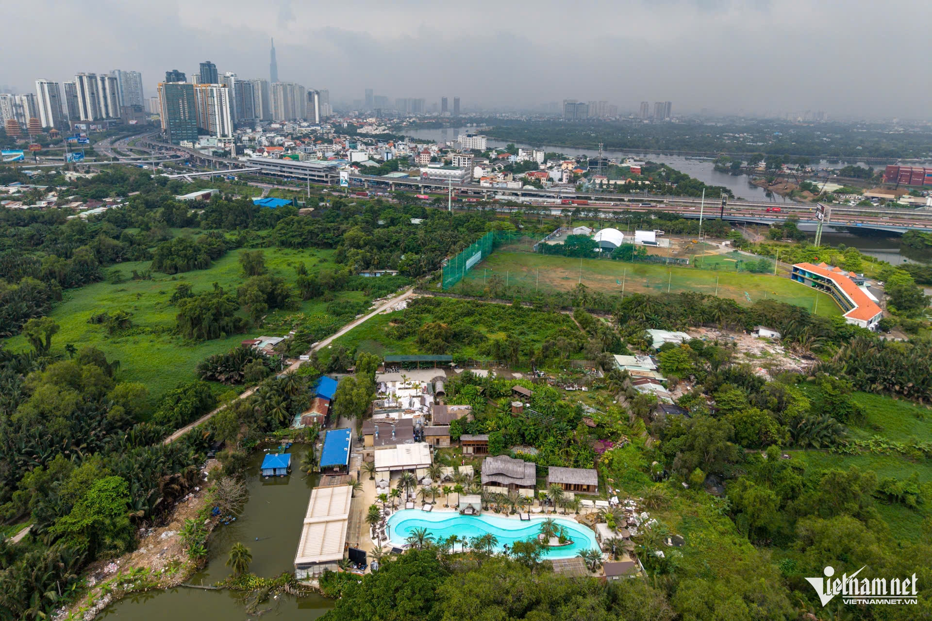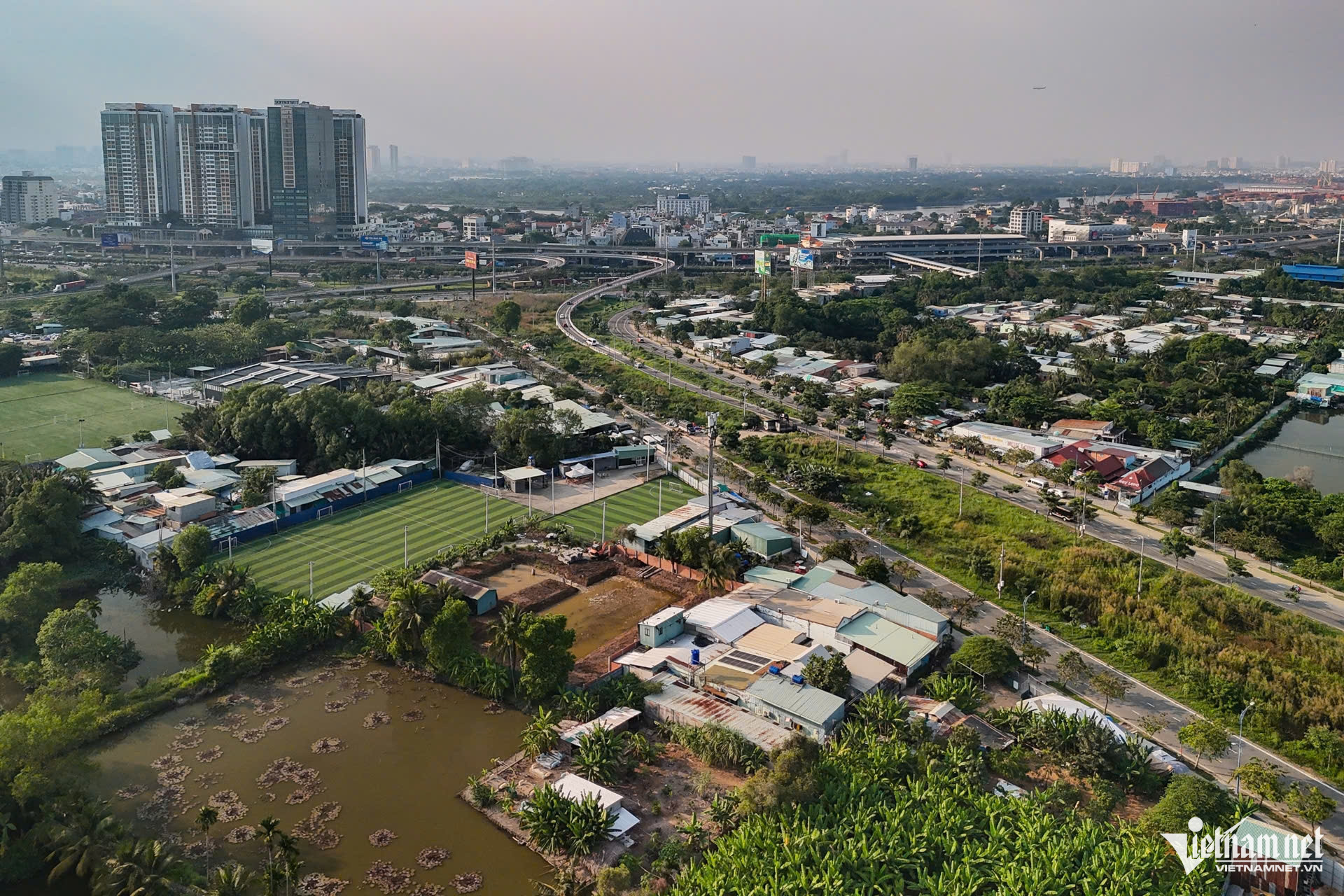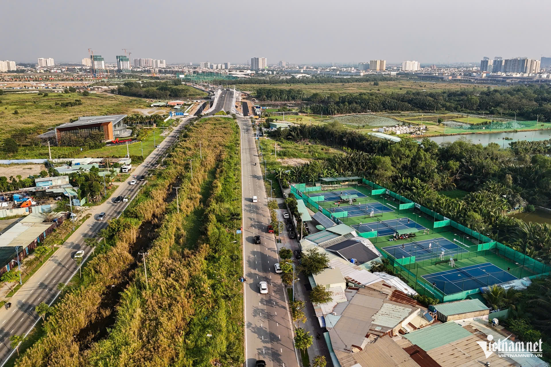 Trong ảnh, một khu du lịch sinh thái nằm giữa Khu Liên hợp Thể dục thể thao Rạch Chiếc. Hướng giáp tuyến song hành Mai Chí Thọ là sân Golf Rạch Chiếc.