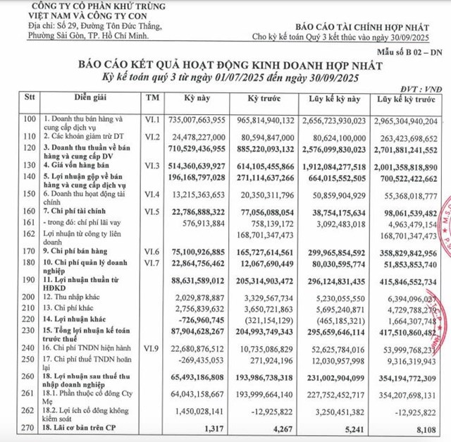 CTCP Khử trùng Việt Nam (mã ck: VFG) vừa công bố kết quả kinh doanh quý III/2025 và 9 tháng đầu năm.