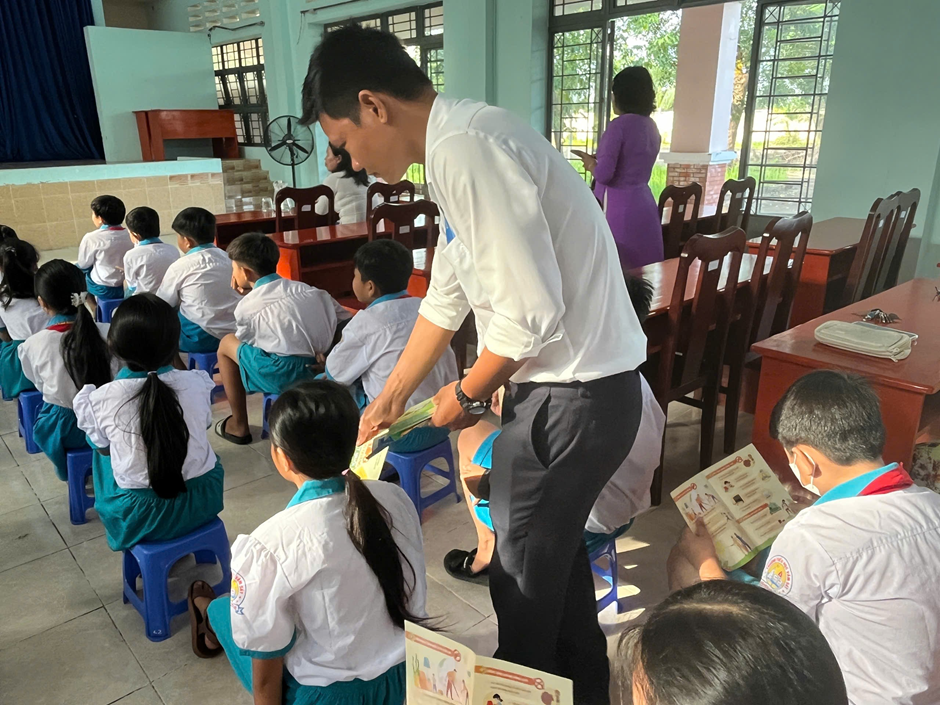 Nhân viên Trạm Y tế phát tờ rơi đến các em học sinh/Ảnh hcdc.vn