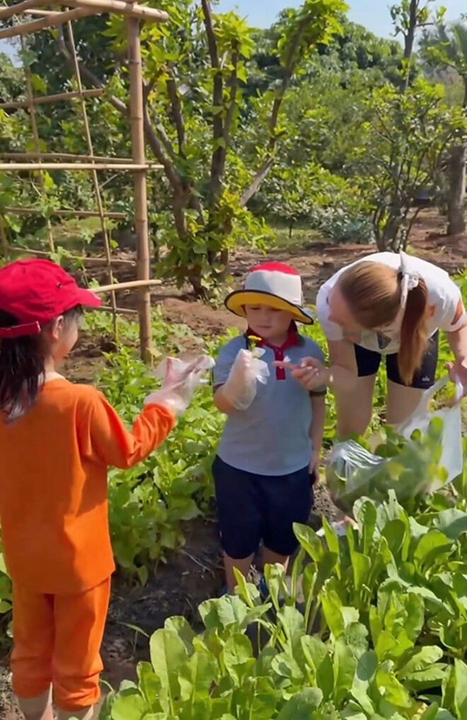 Bà xã của anh - Lý Thùy Chang cũng khoe video thu hoạch nông sản đầy ắp giỏ. Cô chia sẻ: "Gia Khang về thăm vườn và làm bác nông dân đây". "Mấy ngày nghỉ lễ Chang cho 2 con vận động, tập làm vườn và hít thở ít oxy tươi. Chủ đích cũng muốn dạy con biết trân quý lao động. Các cô xem bác nông dân Gia Khang hái được những trái gì nè?", người đẹp bày tỏ.