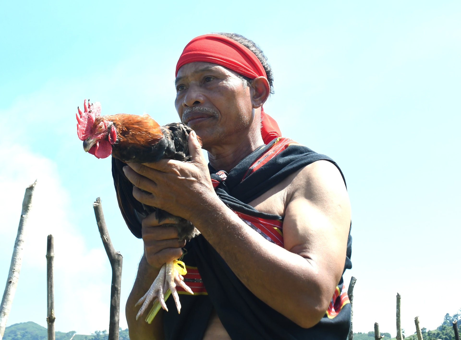 Già làng người Co Đinh Văn Hải (thôn làng Gạch, xã Trà Liên) và vật hiến sinh gà sống trong lễ cầu mưa. Ảnh: BÌNH MINH