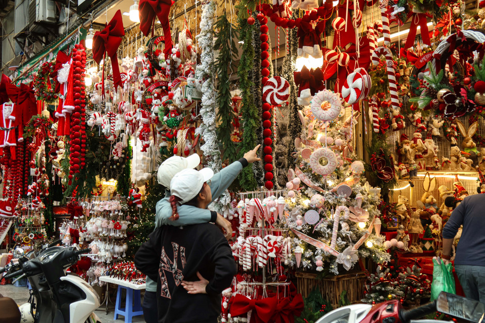 Năm nay, các mặt hàng trang trí Giáng sinh trên phố Hàng Mã trở nên phong phú, đa dạng về mẫu mã, nhiều sản phẩm được thiết kế tinh xảo, bắt mắt, thu hút sự chú ý của người tiêu dùng. (Ảnh: Nhật Minh/Vietnam+)