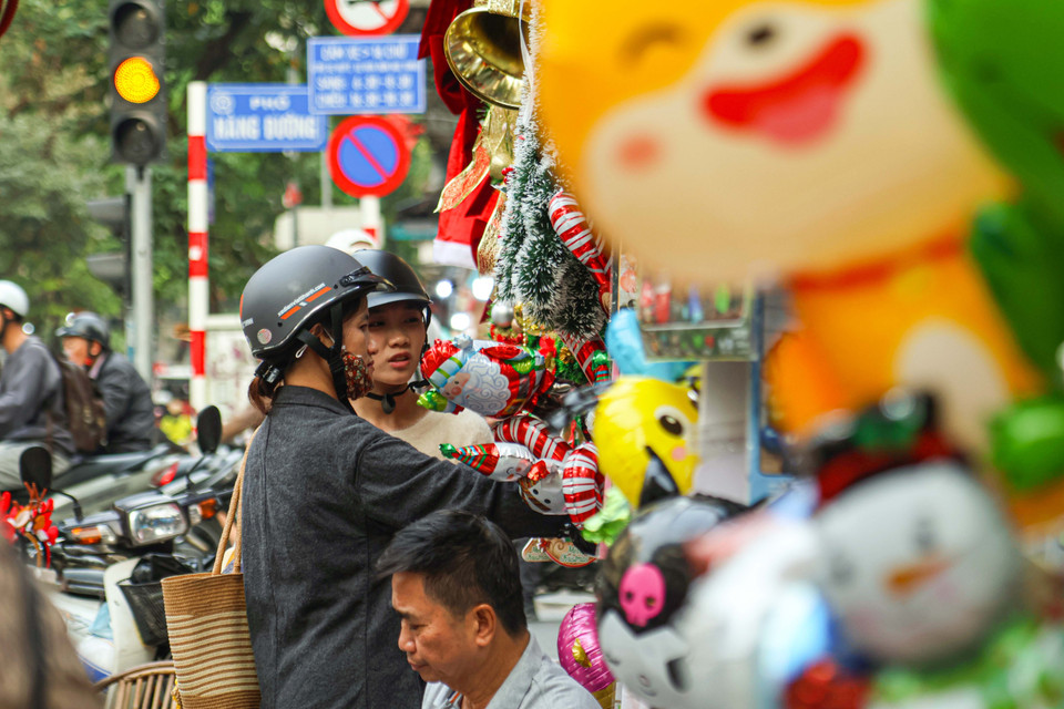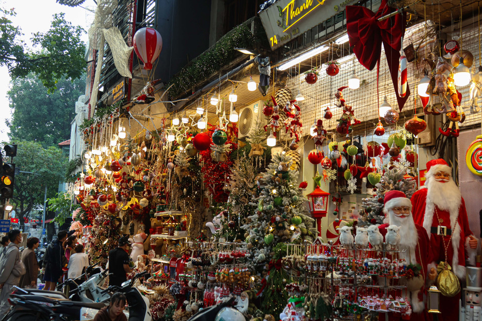 Phố Hàng Mã (phường Hoàn Kiếm, Hà Nội) thời gian này cũng khoác lên mình không khí Giáng sinh rực rỡ ánh đỏ, xanh, vàng từ các mặt hàng trang trí. (Ảnh: Nhật Minh/Vietnam+)