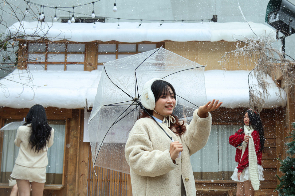 Một quán càphê tại phường Quốc Tử Giám đã đặc biệt bố trí khu vực phun tuyết giả, tạo hiệu ứng mùa Đông thu hút đông đảo khách trẻ. (Ảnh: Nhật Minh/Vietnam+)