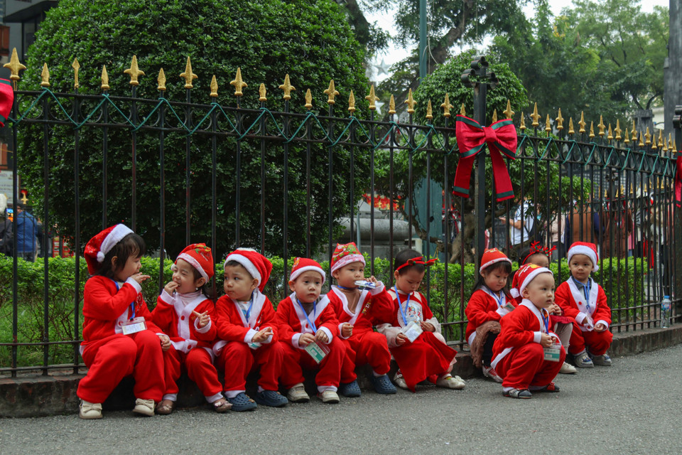 Các lớp mẫu giáo tại khu vực gần Nhà thờ Lớn tổ chức cho các em nhỏ hóa trang, tham quan, chụp ảnh và cảm nhận không khí Giáng sinh trước thềm lễ. (Ảnh: Nhật Minh/Vietnam+)