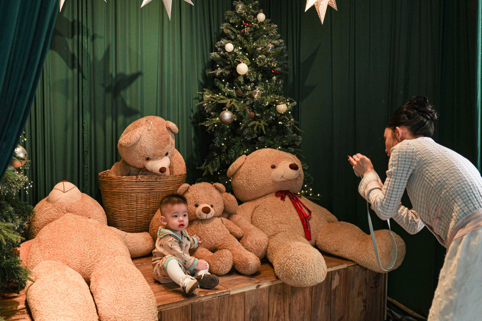 Nhiều gia đình đưa con nhỏ đến tham quan, vui chơi và chụp ảnh, tận hưởng không khí Giáng sinh trong không gian trang trí rực rỡ tại quán càphê. (Ảnh