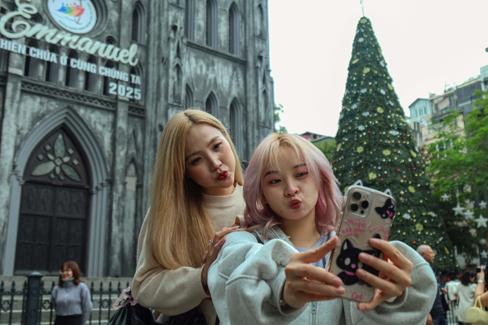 Nhiều bạn trẻ thích thú ghé thăm, chụp hình trước Nhà thờ Lớn và chia sẻ cảm xúc hào hứng, niềm vui khi hòa mình vào không khí Giáng sinh đang lan tỏa khắp Thủ đô. (Ảnh: Nhật Minh/Vietnam+)