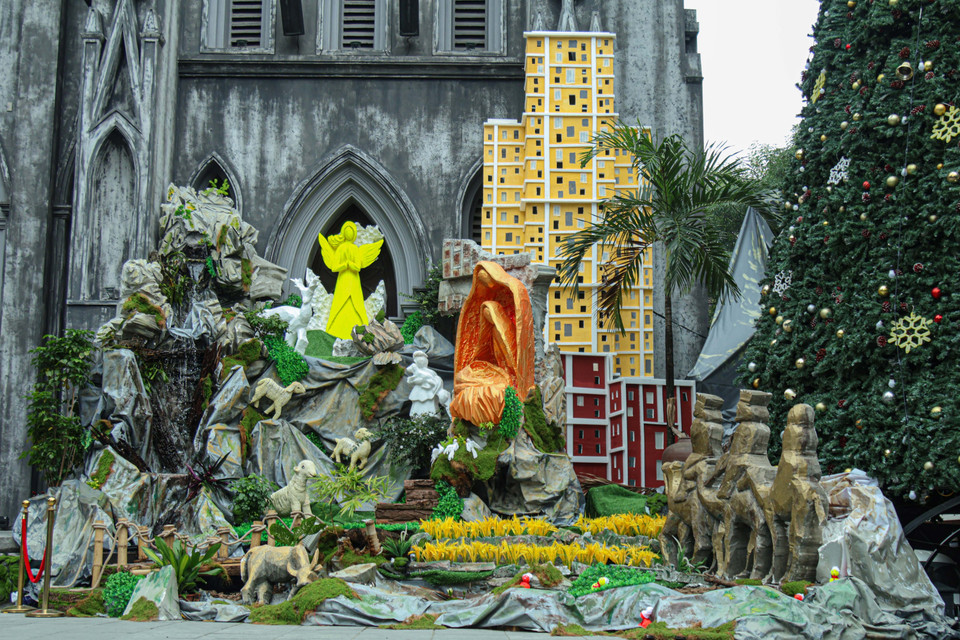 Trước thềm lễ, khuôn viên nhà thờ được trang hoàng với cây thông cỡ lớn cùng tiểu cảnh bằng đá tinh xảo, đặc sắc. (Ảnh: Nhật Minh/Vietnam+)