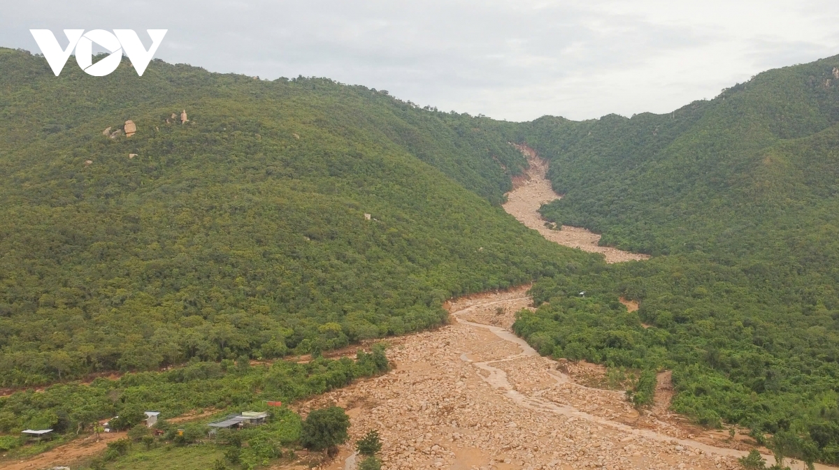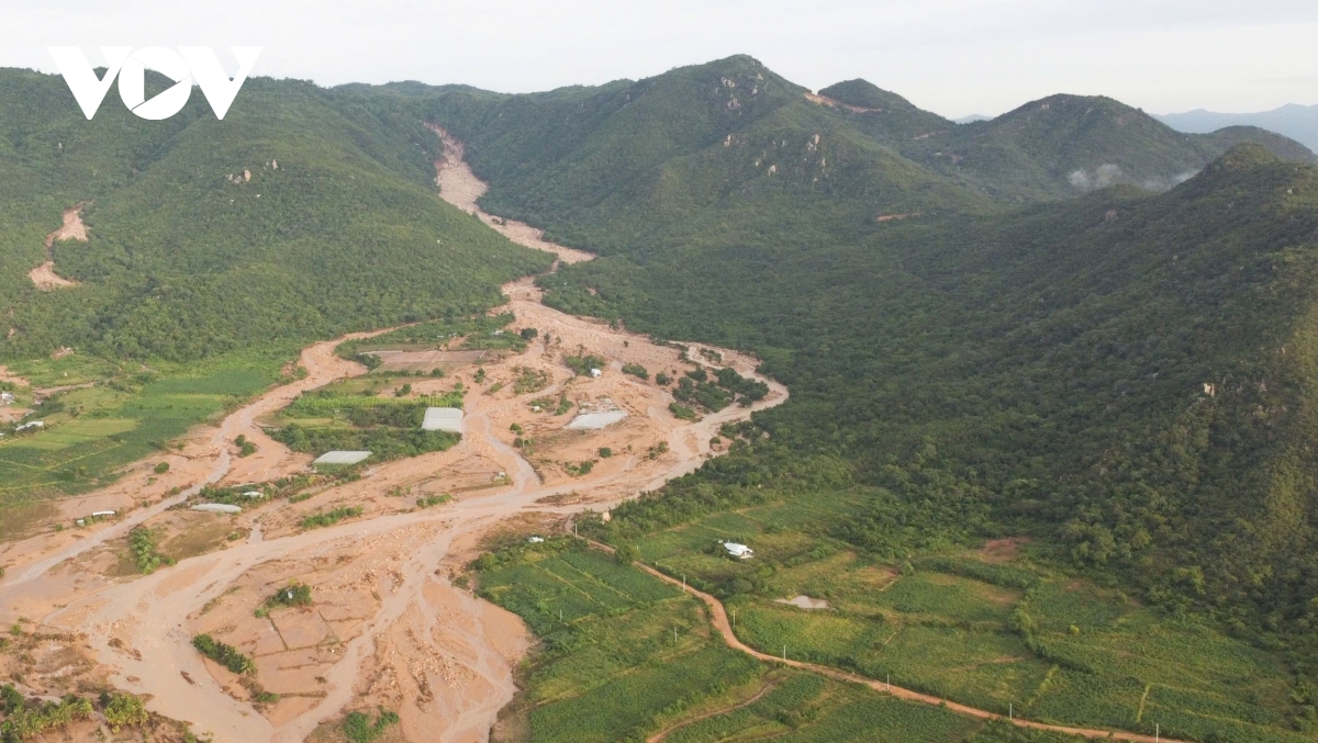 Dòng nước lũ từ thượng nguồn – nơi con đập bị vỡ đổ xuống xã Tuy Phong, cày xới toàn bộ khu dân cư và vùng sản xuất. Ảnh chụp từ trên cao cho thấy rõ vệt đất đỏ kéo dài như một con suối hung dữ vừa quét qua, để lại dải bùn loang lổ giữa màu xanh rừng núi.