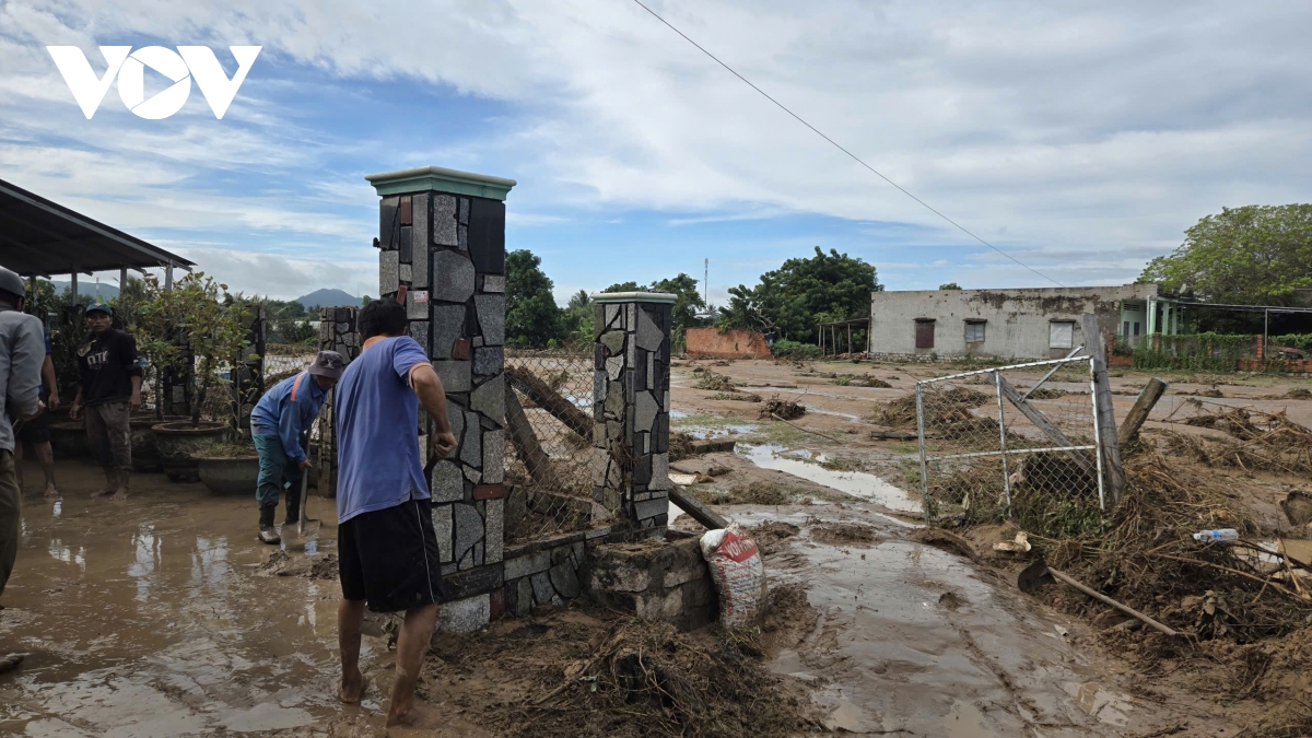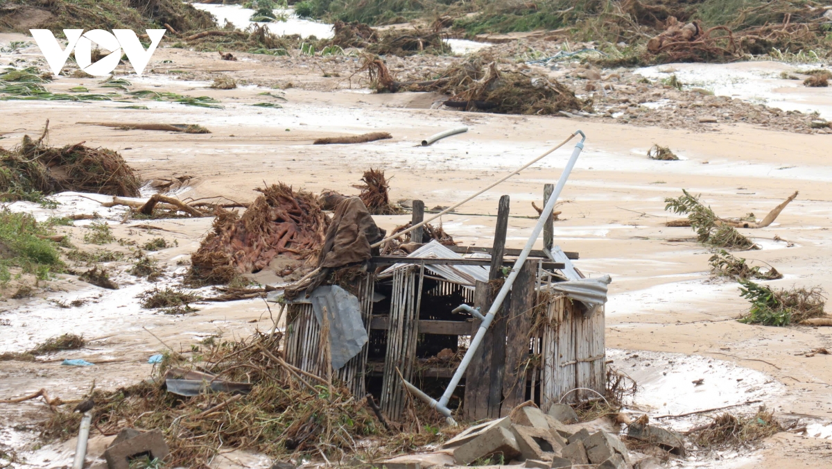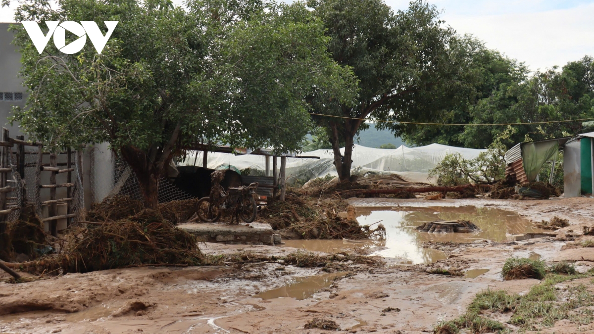 Khung cảnh tan hoang bao trùm thôn 2, xã Tuy Phong – nơi nước rút để lại những hố sâu và bùn ngập lối.