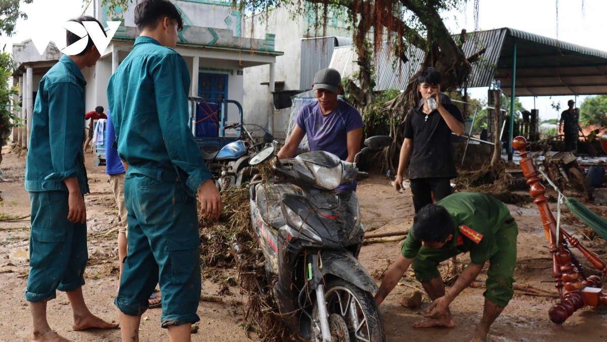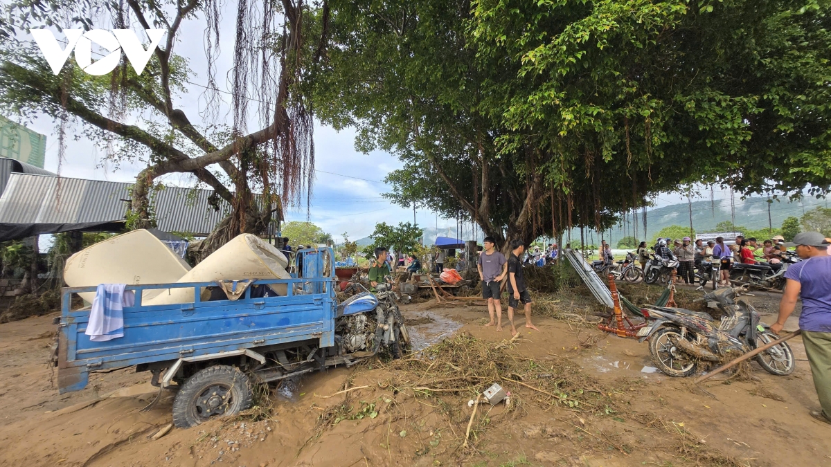 Lực lượng chức năng hỗ trợ người dân thu dọn phương tiện, tài sản bị lũ cuốn. Từ sáng sớm, hàng chục cán bộ, chiến sĩ công an, dân quân tự vệ đã có mặt, giúp dân dựng lại đồ đạc, dọn sạch bùn đất trong nhà.