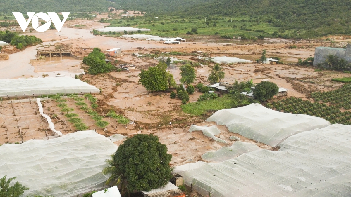 Những nhà kính trồng thanh long, táo và rau màu bị nước cuốn sập. Hàng chục hecta sản xuất nông nghiệp công nghệ cao thiệt hại nặng nề.