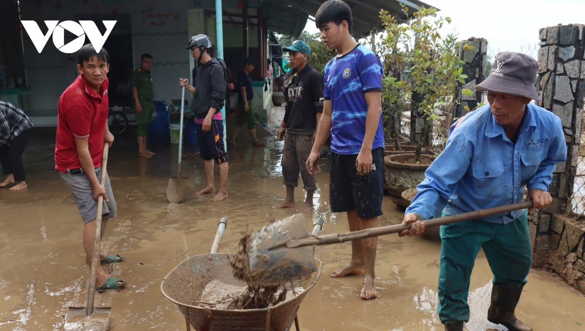 Lực lượng dân quân, công an và người dân cùng nhau xúc dọn bùn đất trong sân nhà bị ngập. Không khí nặng nề nhưng chan chứa tình làng nghĩa xóm.