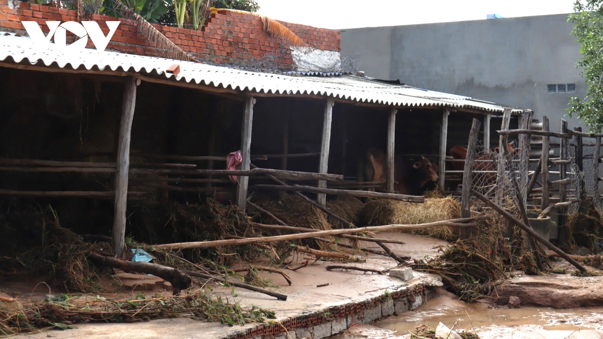 Chuồng trại chăn nuôi bị nước lũ làm sập mái, nhiều con bò, dê bị chết hoặc trôi mất. Người dân cho biết, hàng chục hộ mất trắng toàn bộ tài sản chỉ sau một đêm.