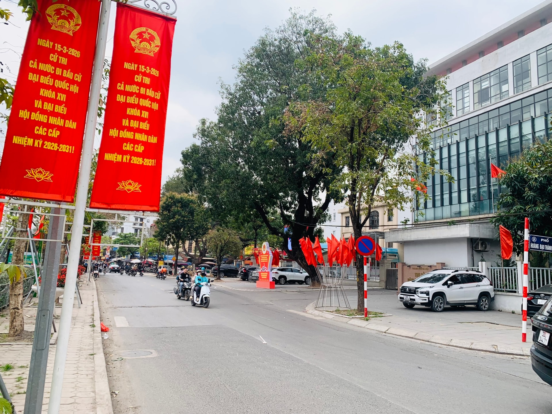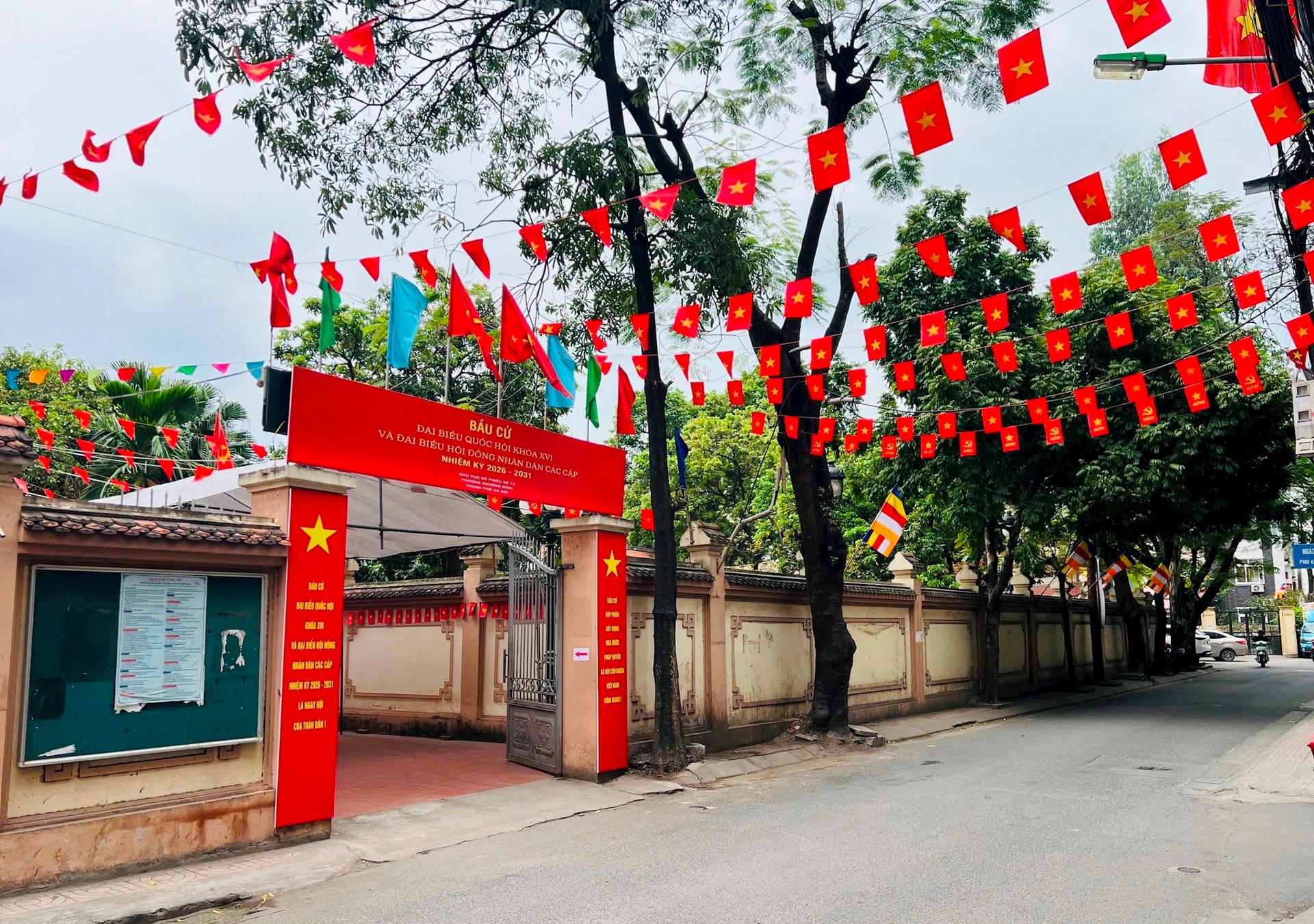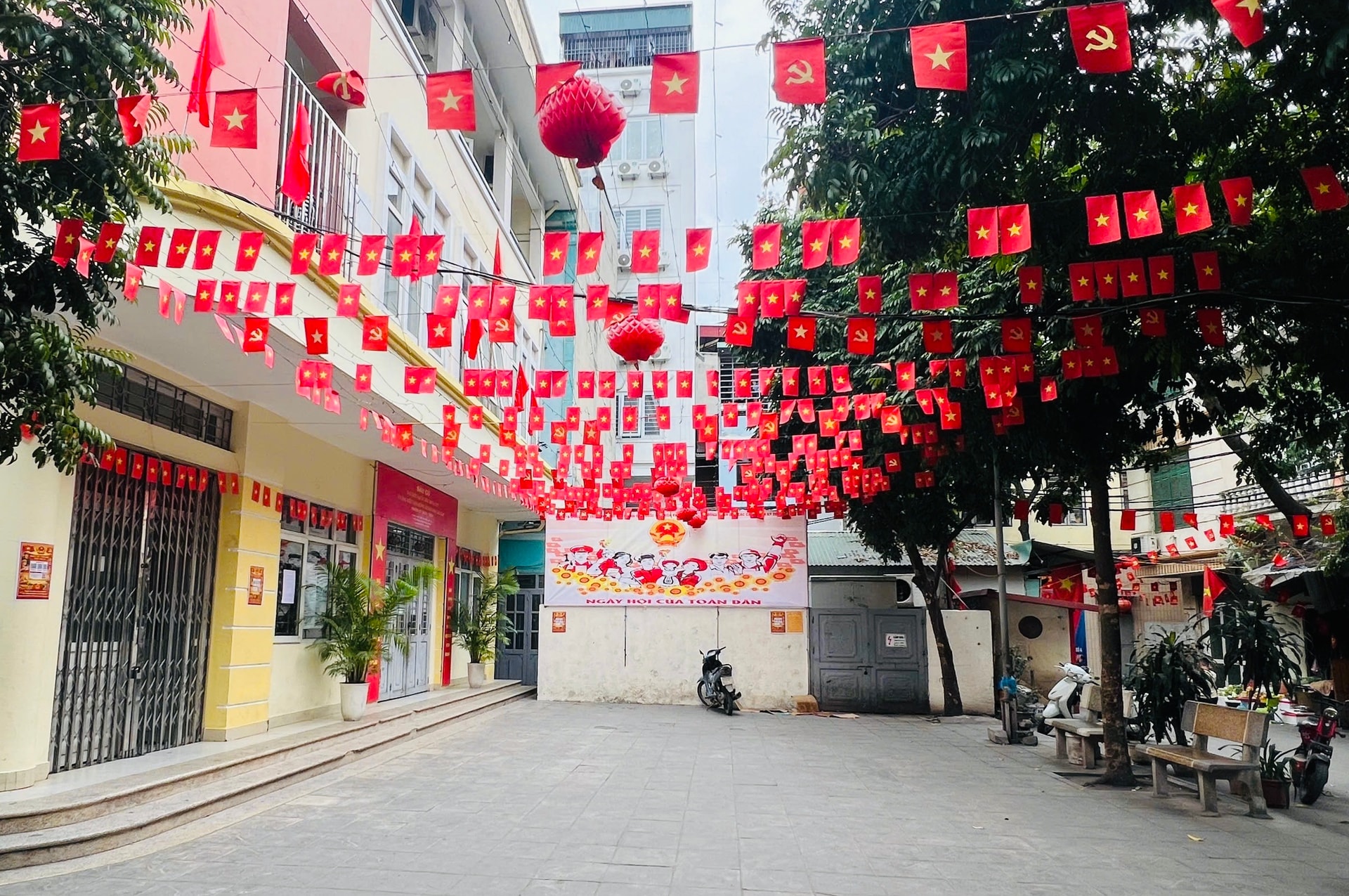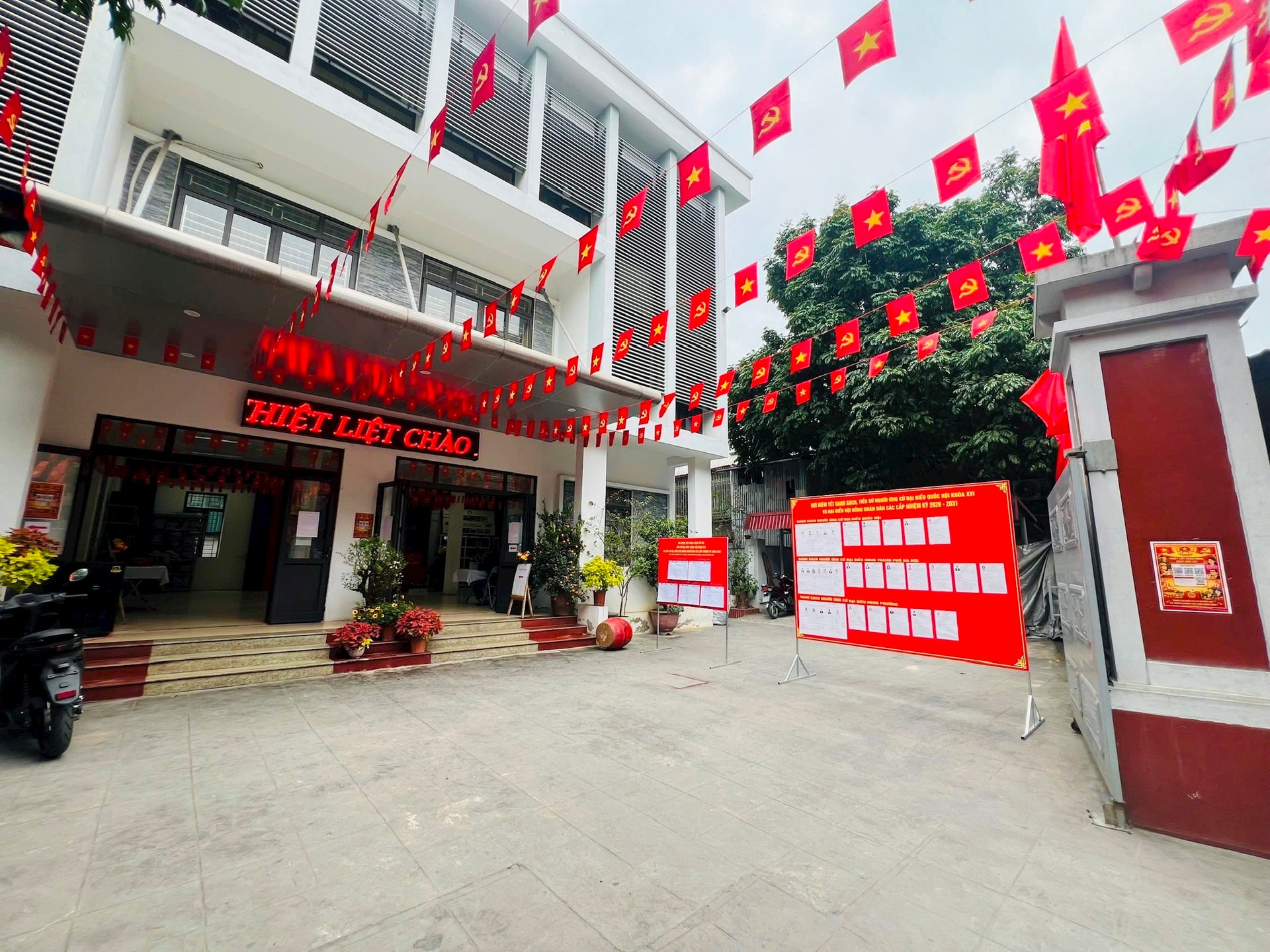 Hình ảnh trước trụ sở Đảng ủy phường Khương Đình. Những tấm panô, áp phích được trang trí, tạo khí thế phấn khởi trong Ngày hội non sông.