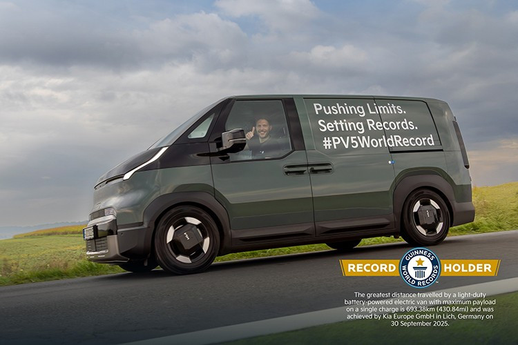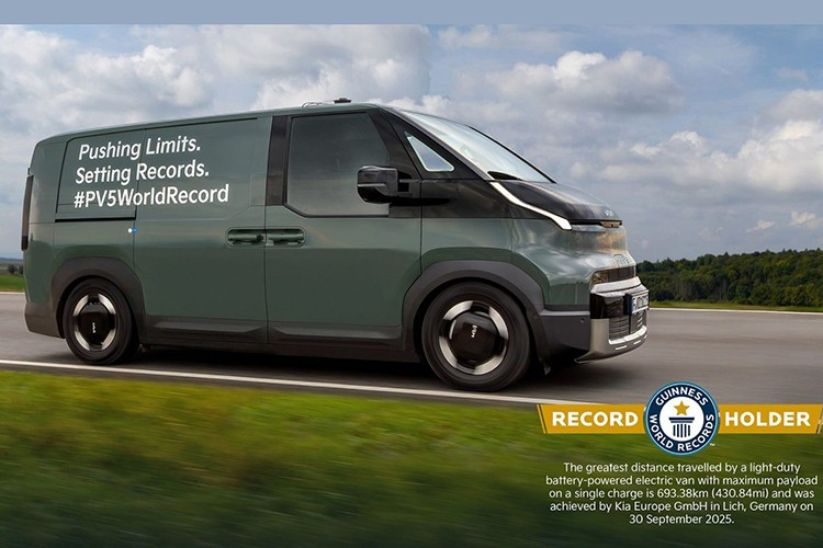 Chiếc van điện Kia PV5 Cargo vừa thiết lập một Kỷ lục Guinness Thế giới mới đầy ấn tượng. Vào ngày 30/9, một chiếc Kia PV5 Cargo phiên bản L2H1 trang bị pin 71,2 kWh đã hoàn thành quãng đường 693,38 km chỉ với một lần sạc, lập kỷ lục về quãng đường di chuyển của một chiếc xe van chạy pin hạng nhẹ.
